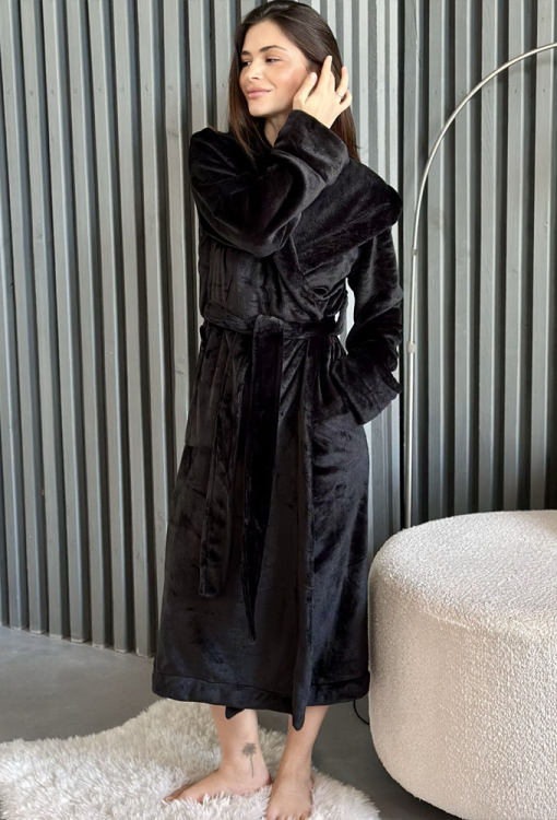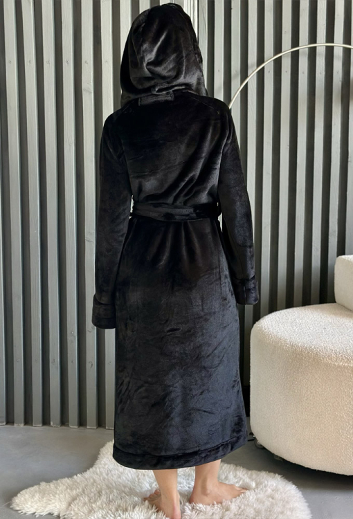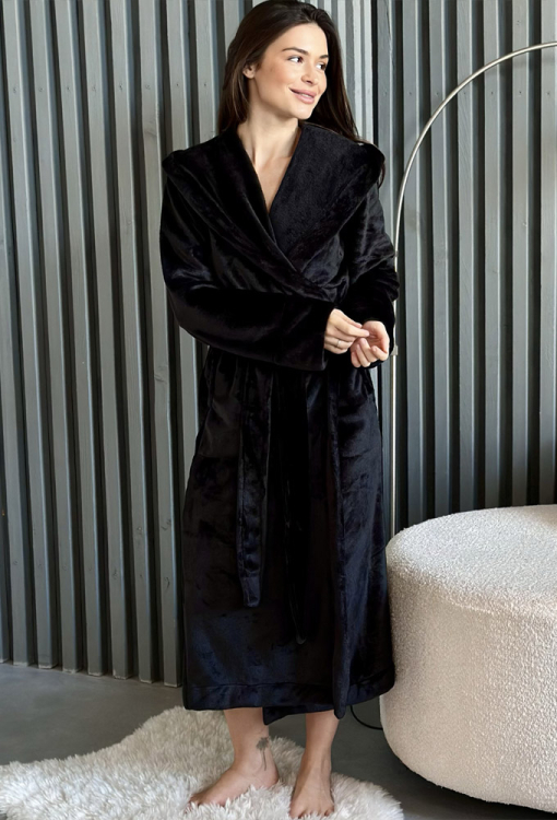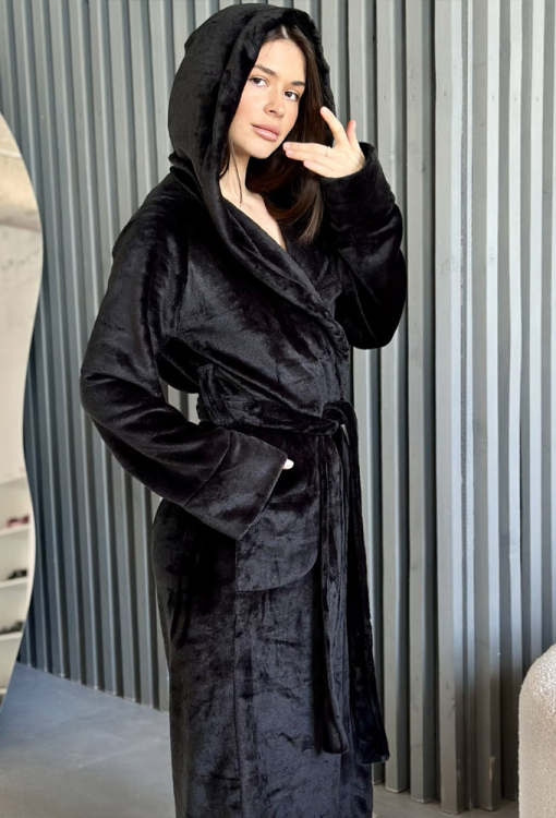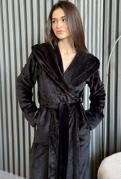 Теплий жіночий халат Black Diamond від українського бренду Cosy. Халат виконаний з якісного та м'якого велсофту чорного кольору, з капюшоном та довжиною нижче колін. Модель з довгими рукавами та зручними бічними кишенями, зав'язується на запах за допомогою пояса. Довжину рукава можна відрегулювати вільними відкладними манжетами. Халат дуже красивий і комфортний, ідеальний для вечірнього відпочинку або ранкового годинника будинку, а також може бути корисним подарунком коханій та близькій людині.