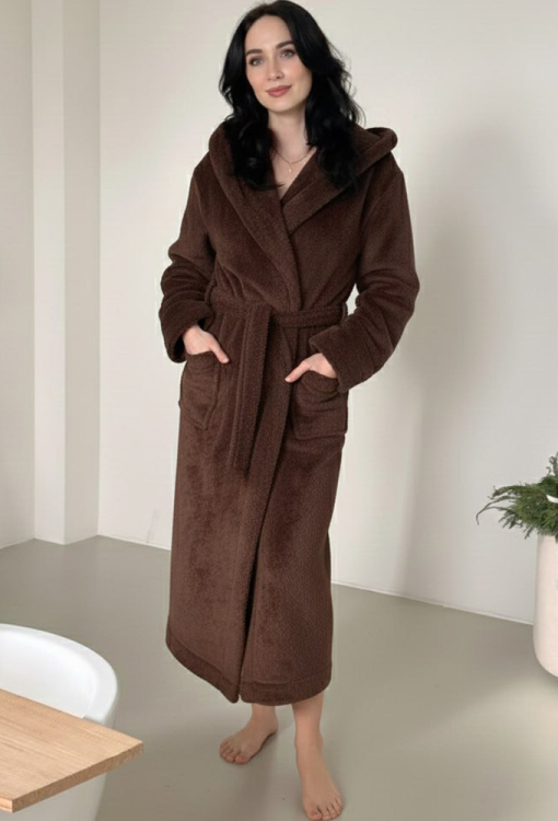 Теплий жіночий халат Cuddle від українського бренду Cosy. Халат виконаний з якісного та м'якого велсофту шоколадного кольору, з капюшоном та довжиною нижче колін. Модель з довгими рукавами та зручними бічними кишенями, зав'язується на запах за допомогою пояса. Довжину рукава можна відрегулювати вільними відкладними манжетами. Халат дуже красивий і комфортний, ідеальний для вечірнього відпочинку або ранкового годинника будинку, а також може бути корисним подарунком коханій та близькій людині.