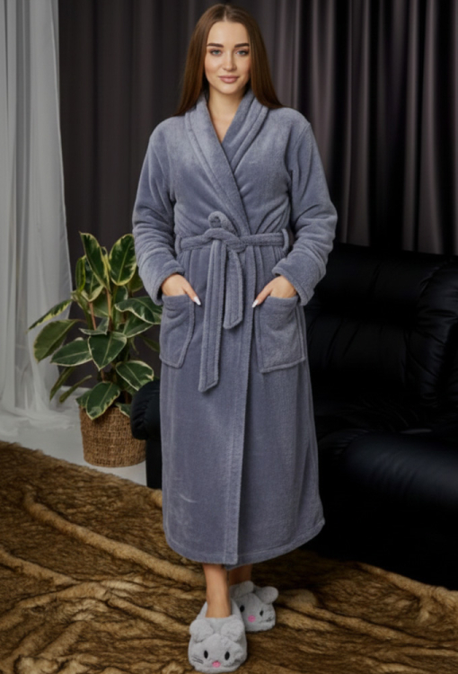 Елегантний жіночий халат від українського бренду Tomiko. Халат виконаний з м'якого та якісного велсофту сірого кольору, вільного силуету та довжиною нижче колін. Модель з довгими рукавами, коміром шаль та зручними накладними кишенями, зав'язується на запах за допомогою пояса, довжина рукава регулюється за допомогою відкладних манжет. Халат красивий і дуже комфортний, забезпечить тепло та затишок в холодну пору року, також може бути чудовим подарунком коханій та близькій людині!