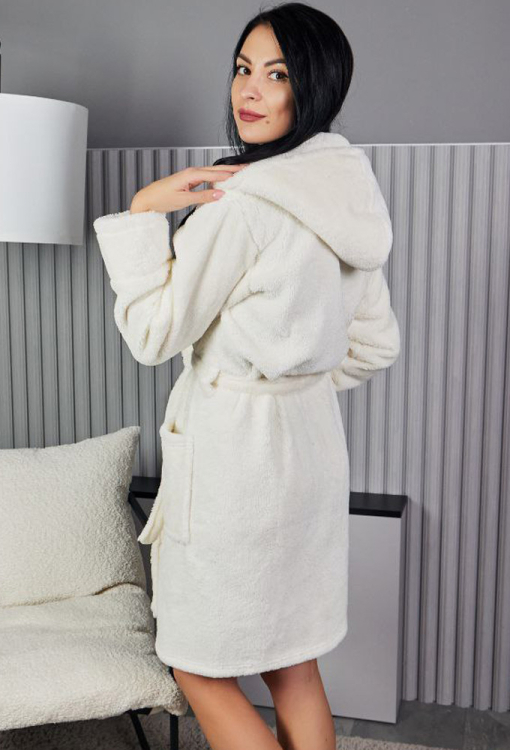 Теплий та приємний до тіла жіночий халат від українського бренду Tomiko. Халат виконаний з м'якого та якісного велсофту кремового кольору, вільного силуету та довжиною вище колін. Модель з довгими рукавами, подвійним каптуром та зручними накладними кишенями, зав'язується на запах за допомогою пояса, довжина рукава регулюється відкладними манжетами. Халат стильний дуже комфортний, зігріє в холодну пору року, також може бути чудовим подарунком коханій та близькій людині!
