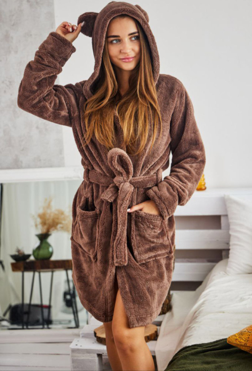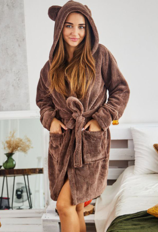 Красивий та теплий жіночий халат від українського бренду Tomiko. Халат виконаний з м'якого та якісного велсофту шоколадного кольору, вільного силуету та довжиною вище колін. Модель з довгими рукавами, двома накладними кишенями та капюшоном з потішними вушками, зав'язується на запах за допомогою пояса, довжина рукава регулюється відкладними манжетами. Халат стильний і дуже комфортний, зігріє в холодну пору року, також може бути чудовим подарунком коханій та близькій людині!