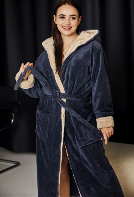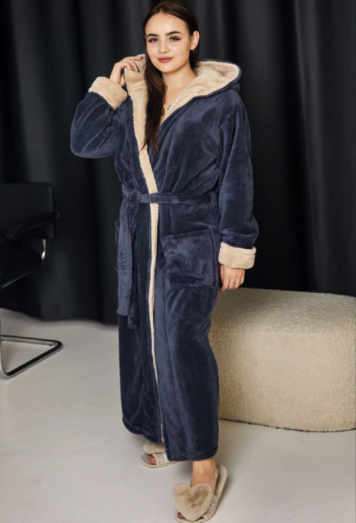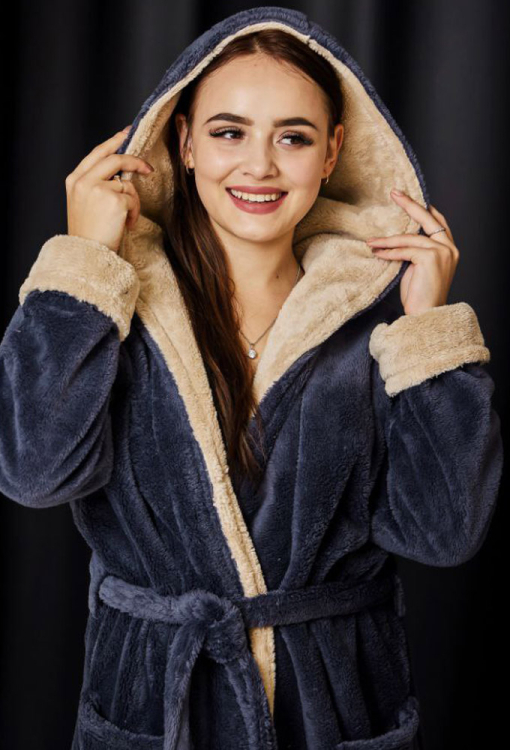 Стильний жіночий халат від українського бренду Tomiko. Халат виконаний з м'якого та якісного велсофту графітового кольору, вільного силуету та довжиною до підлоги. Модель з довгими рукавами, подвійним каптуром та зручними накладними кишенями, зав'язується на запах за допомогою пояса, довжина рукава регулюється за допомогою відкладних манжет. Внутрішня сторона капюшона та манжети виконані з велсофту кольору капучино. Халат красивий і дуже комфортний, забезпечить тепло та затишок в холодну пору року, також може бути чудовим подарунком коханій та близькій людині!