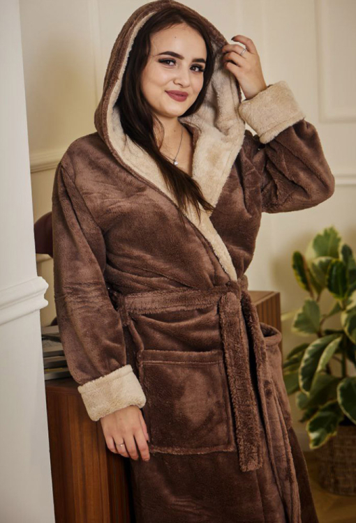 Затишний жіночий халат від українського бренду Tomiko. Халат виконаний з м'якого та якісного велсофту шоколадного кольору, вільного силуету та довжиною до підлоги. Модель з довгими рукавами, подвійним каптуром та зручними накладними кишенями, зав'язується на запах за допомогою пояса, довжина рукава регулюється за допомогою відкладних манжет. Внутрішня сторона капюшона та манжети виконані з велсофту кольору капучино. Халат красивий і дуже комфортний, забезпечить тепло та затишок в холодну пору року, також може бути чудовим подарунком коханій та близькій людині!