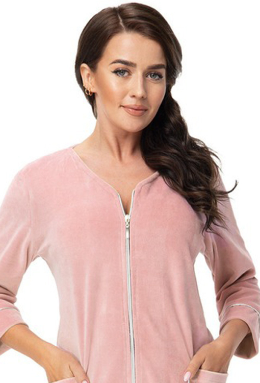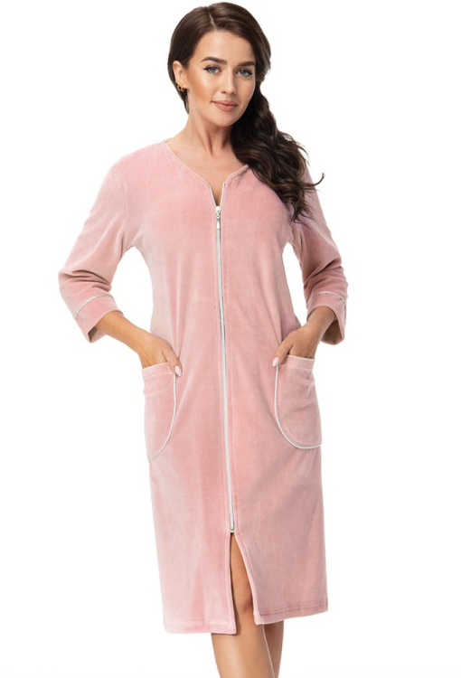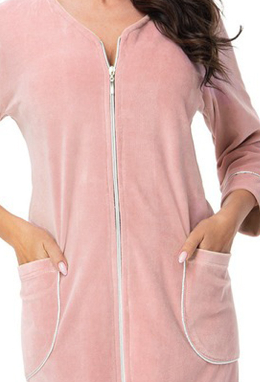 Елегантний жіночий халат від польського бренду Dorota. Халат виконаний з м'якого та якісного велюру пудрового кольору, з рукавами 3/4 та довжиною трохи нижче колін. Модель із круглим вирізом горла та зручними накладними кишенями, застібається на блискавку. Рукави та кишені виробу прикрашені тонким атласним кантом сірого кольору. Халат дуже гарний та комфортний, ідеальний для домашнього користування, також може бути чудовим подарунком коханій чи близькій людині.