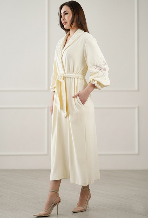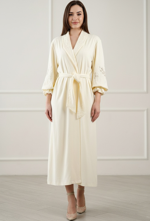 Розкішний жіночий халат Innsbruck від українського бренду Komilfo - втілення елегантності та затишку. Халат виконаний з м'якого та якісного велюру на бавовняній основі кремового кольору, у вільному крої та з ефектною довжиною в підлогу, створюючи шляхетний та жіночний образ. Довгі пишні рукави, витончений комір шаль та зручні бічні кишені забезпечують практичність у повсякденному використанні. Запах із поясом дозволяє легко регулювати посадку та красиво підкреслює талію. Рукави внизу доповнені еластичними манжетами з рюшами та прикрашені вирізними вставками з ажурного мережива, комір та кінці пояса декоровані мереживними аплікаціями. Халат неймовірно красивий та комфортний, а фірмова упаковка робить його ідеальним подарунком для коханих та близьких людей.