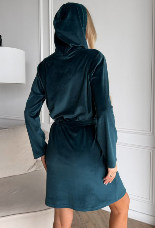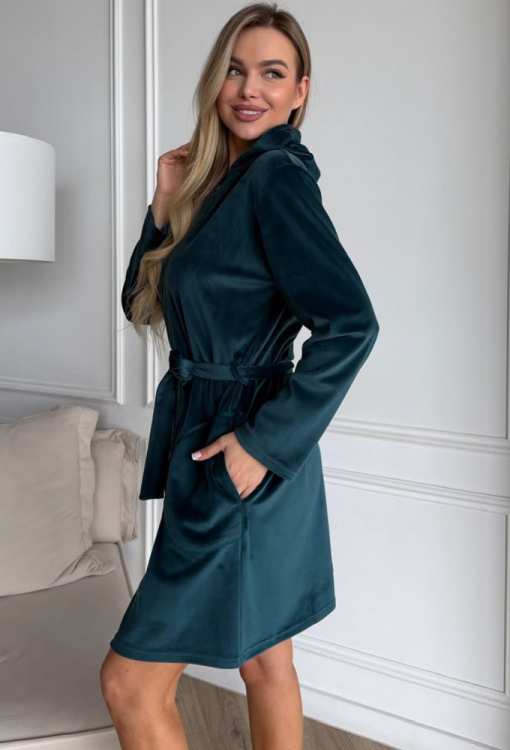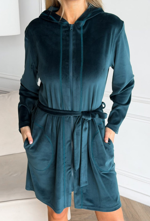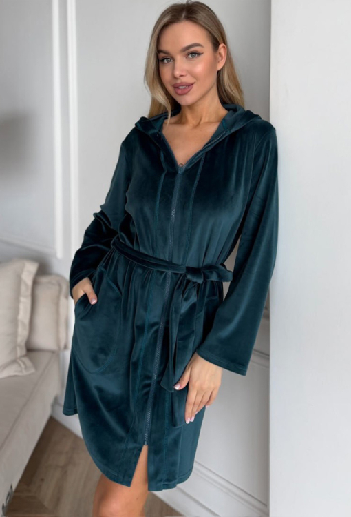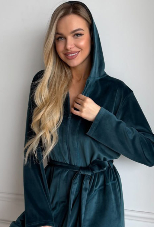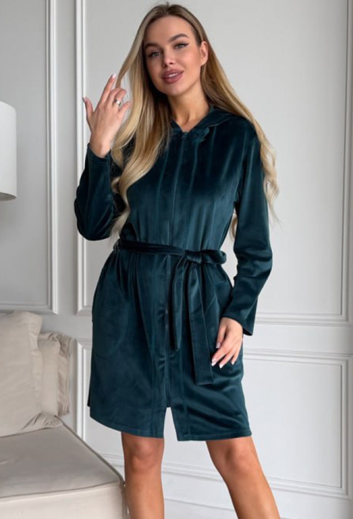 Стильний жіночий халат від українського бренду Julia Ulich. Халат виконаний з м'якого та якісного велюру смарагдового кольору, прямого силуету, з капюшоном і довжиною вище колін. Модель з довгими рукавами та зручними бічними кишенями, застібається на блискавку та зав'язується поясом. Халат дуже красивий і комфортний, забезпечить тепло та затишок у будь-яку пору року, також може бути чудовим подарунком коханій та близькій людині!