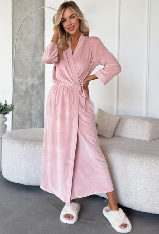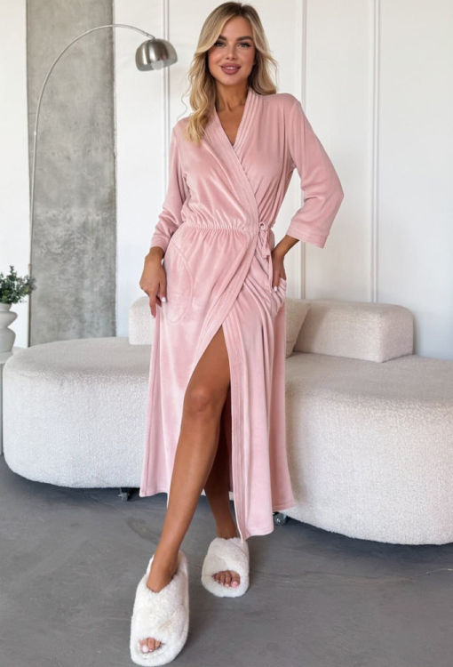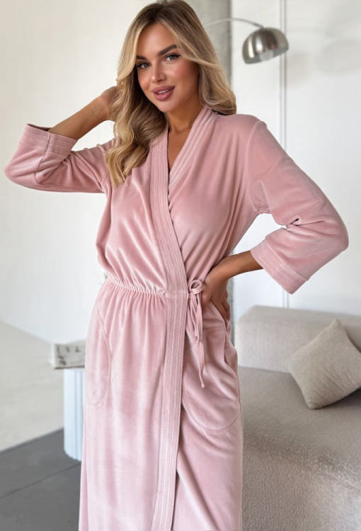 Елегантний жіночий халат від українського бренду Julia Ulich. Халат виконаний з м'якого та якісного велюру персикового кольору, вільного силуету та довжиною нижче колін. Модель з рукавами 3/4 довжини та зручними бічними кишенями, зав'язується на запах за допомогою тонкого внутрішнього поясу, виріз, полиці та рукави прикрашені рельєфними лініями. Халат дуже красивий і комфортний, забезпечить тепло та затишок у будь-яку пору року, також може бути чудовим подарунком коханій та близькій людині!