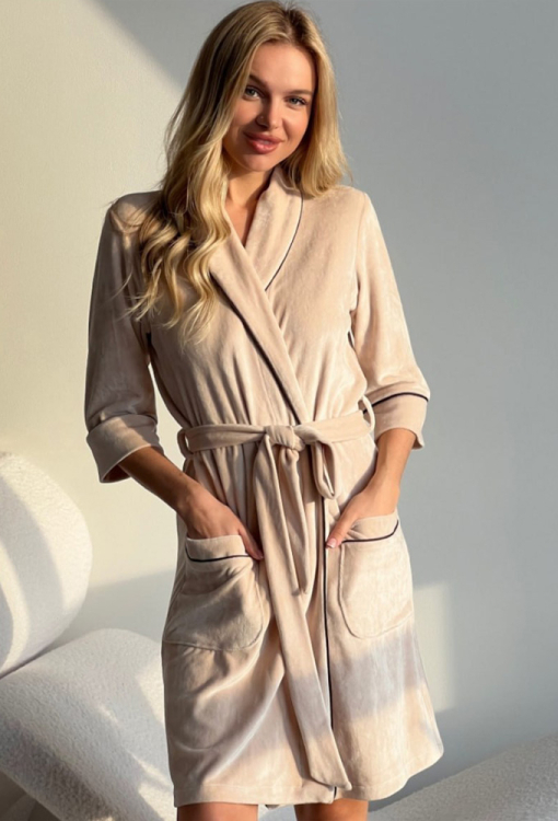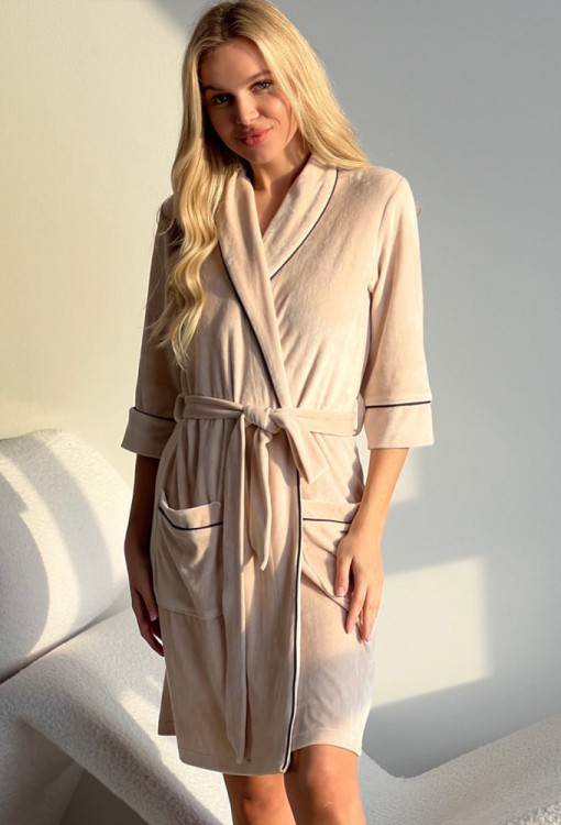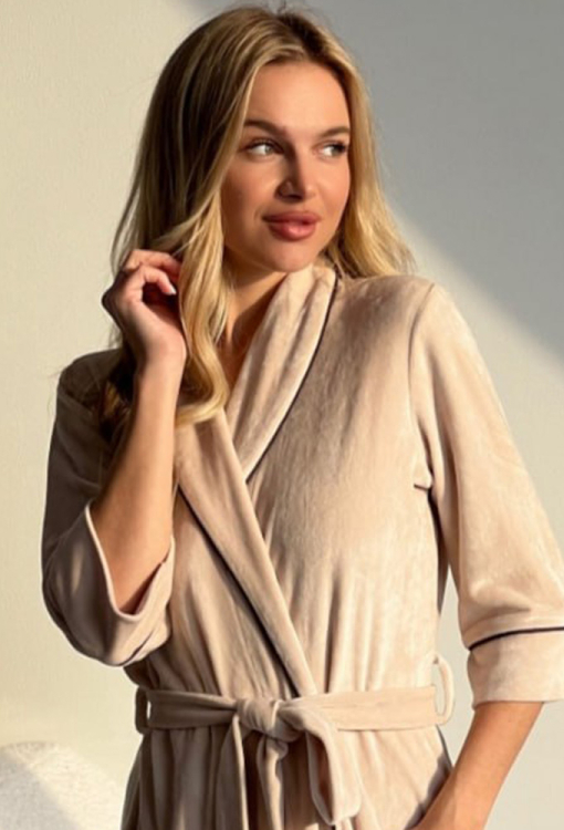 Стильний жіночий халат від українського бренду Julia Ulich - незамінна деталь домашнього гардероба. Халат виконаний з м'якого та якісного велюру кремового кольору, вільного силуету та довжиною вище колін. Модель з коміром шаль, рукавами 3/4 довжини та зручними накладними кишенями, зав'язується на запах за допомогою пояса, створюючи комфортну посадку та підкреслюючи талію. Рукави виробу оброблені вільними манжетами та тонким кантом чорного кольору, комір, полиці та кишені також прикрашені контрастним кантом. Халат дуже красивий і комфортний, дозволить почуватися особливо в домашньому оточенні, також може бути чудовим подарунком коханій та близькій людині!