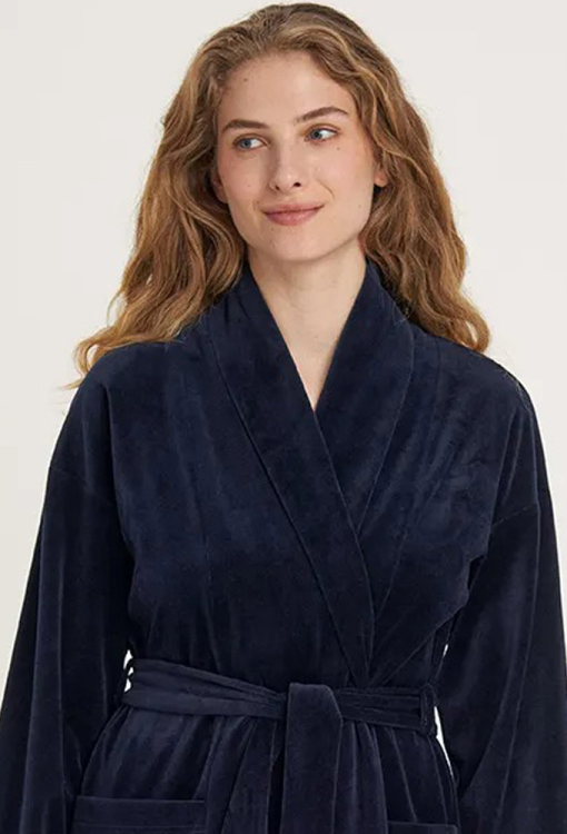 Теплий жіночий халат з колекції Mare від українського бренду Ellen. Халат виконаний з якісного та м'якого велюру темно-синього кольору, вільного силуету та довжиною вище колін. Модель з довгими рукавами та двома накладними кишенями, зав'язується на запах за допомогою пояса. Халат дуже гарний та комфортний, ідеальний для домашнього користування, також може бути чудовим подарунком коханій чи близькій людині.