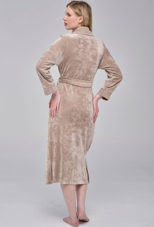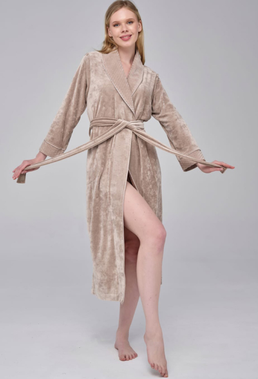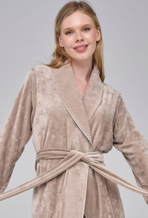 Елегантний жіночий халат від турецького бренду Nusa. Халат виконаний з м'якого та якісного велюру бежевого кольору, з довгими рукавами, коміром шаль та бічними розрізами. Модель вільного силуету, довжиною нижче колін та зі зручними бічними кишенями, зав'язується на запах за допомогою пояса. Комір та манжети на рукавах виконані з фактурного велюру та прикрашені тонким кантом. Халат дуже красивий та комфортний, ідеальний для домашніх затишних вечорів та прохолодного ранку, а також може бути корисним подарунком коханій та близькій людині.