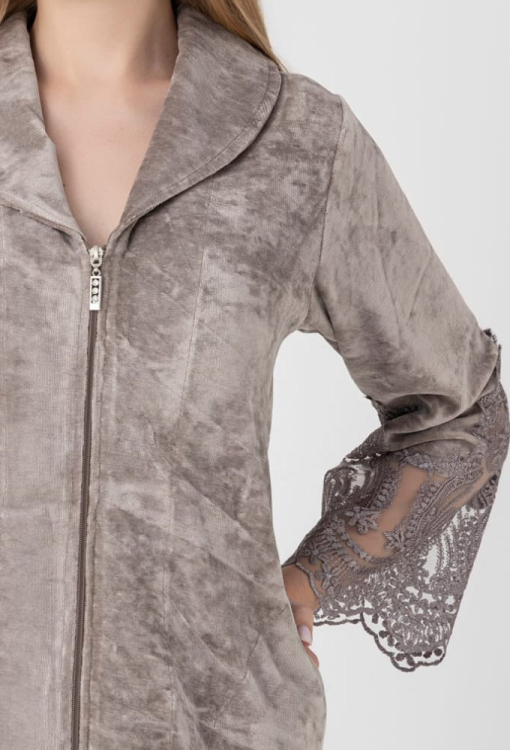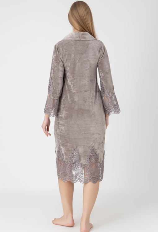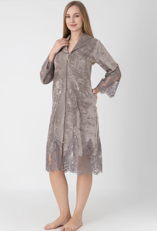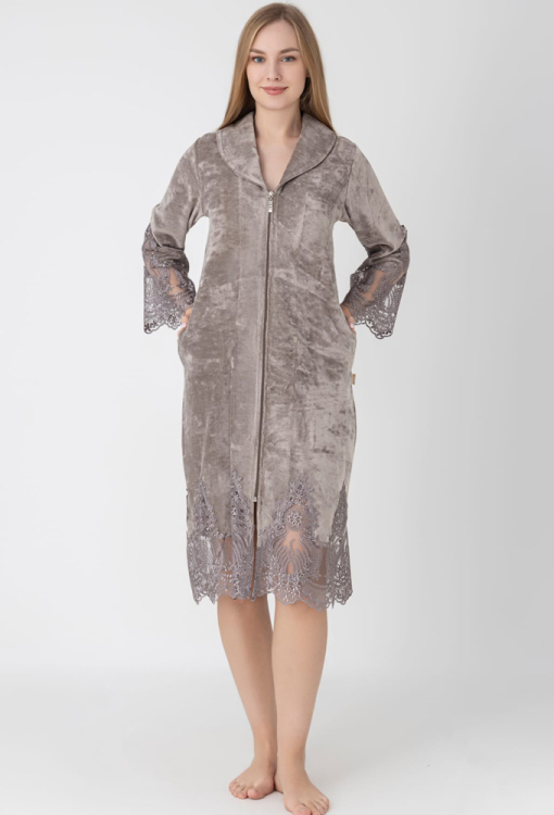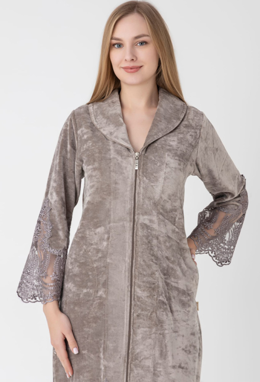 Стильний жіночий халат від турецького бренду Nusa. Халат виконаний з м'якого та якісного велюру бежевого кольору, з довгими рукавами та відкладним коміром. Модель прямого силуету, завдовжки трохи нижче колін і зі зручними бічними кишенями, застібається на блискавку. Рукави та низ виробу прикрашені широкими вставками із розкішного вирізного мережива. Халат дуже гарний та зручний, ідеальний для домашніх затишних вечорів та прохолодного ранку, а також може бути корисним подарунком коханій та близькій людині.