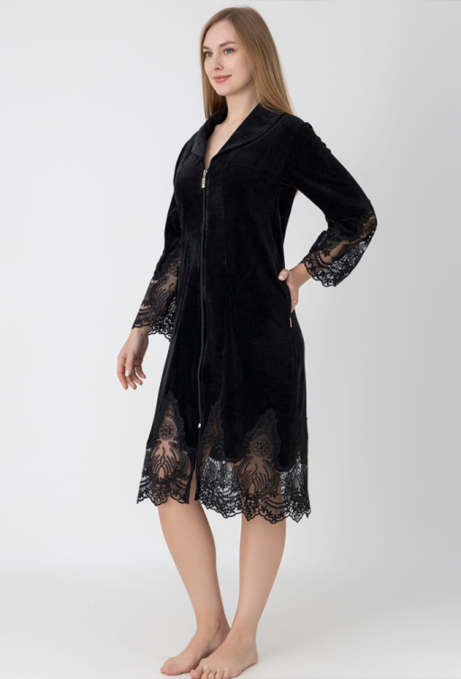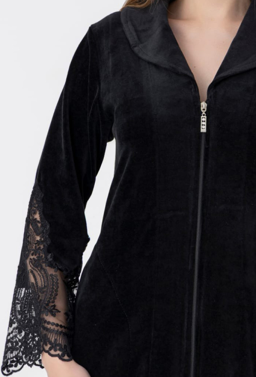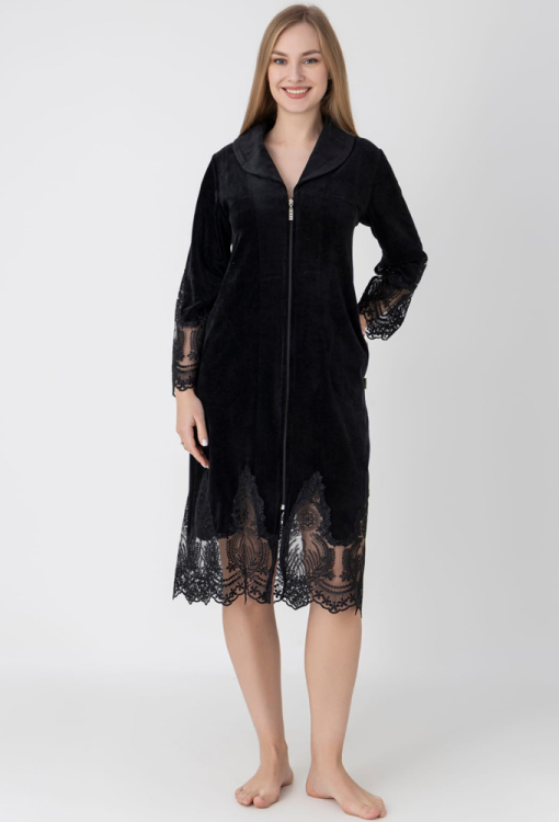 Стильний жіночий халат від турецького бренду Nusa. Халат виконаний з м'якого та якісного велюру чорного кольору, з довгими рукавами та відкладним коміром. Модель прямого силуету, завдовжки трохи нижче колін і зі зручними бічними кишенями, застібається на блискавку. Рукави та низ виробу прикрашені широкими вставками із розкішного вирізного мережива. Халат дуже гарний та зручний, ідеальний для домашніх затишних вечорів та прохолодного ранку, а також може бути корисним подарунком коханій та близькій людині.
