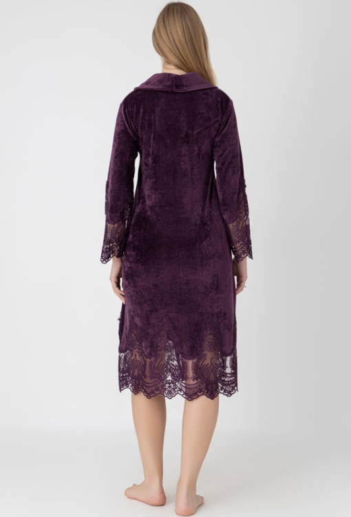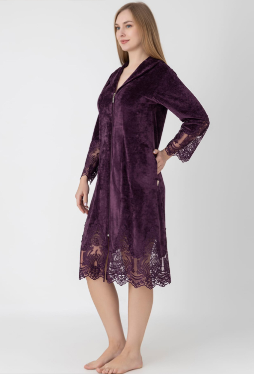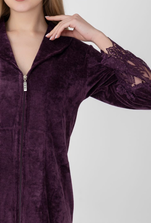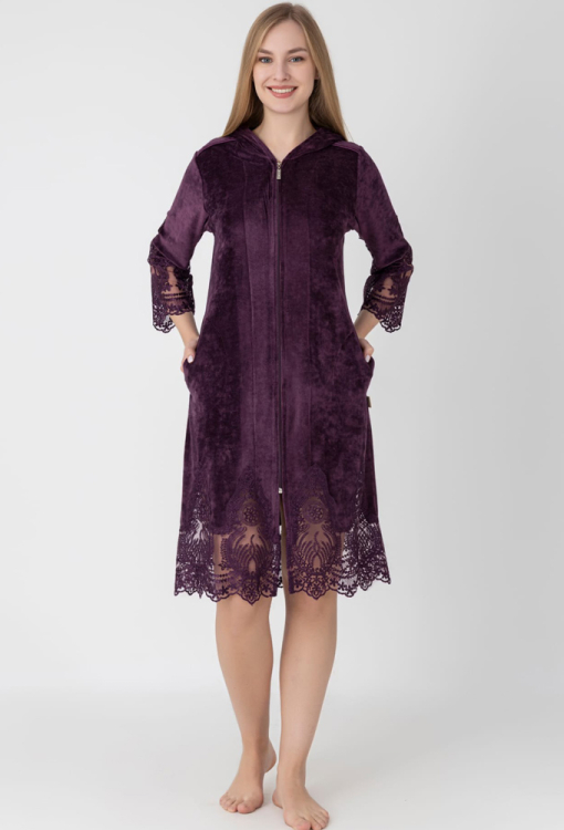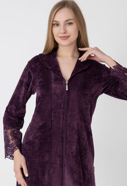 Стильний жіночий халат від турецького бренду Nusa. Халат виконаний з м'якого та якісного велюру фіолетового кольору, з довгими рукавами та відкладним коміром. Модель прямого силуету, завдовжки трохи нижче колін і зі зручними бічними кишенями, застібається на блискавку. Рукави та низ виробу прикрашені широкими вставками із розкішного вирізного мережива. Халат дуже гарний та зручний, ідеальний для домашніх затишних вечорів та прохолодного ранку, а також може бути корисним подарунком коханій та близькій людині.