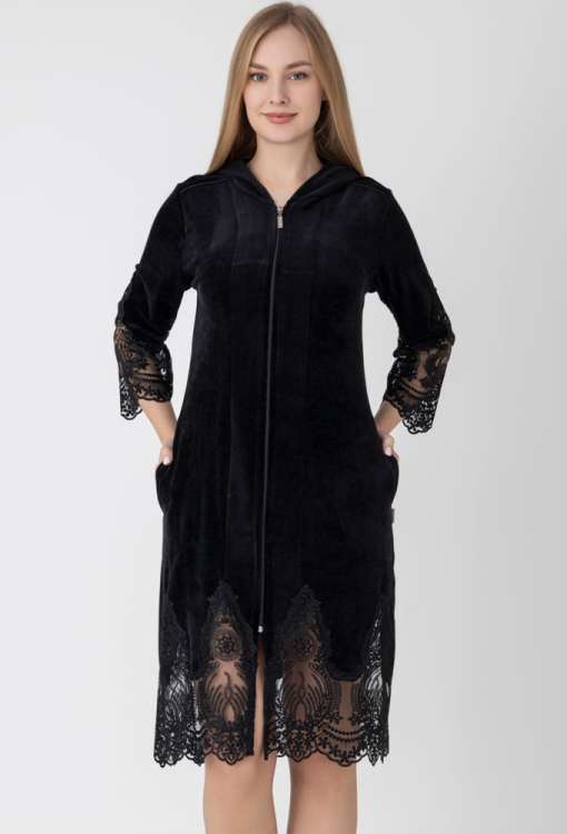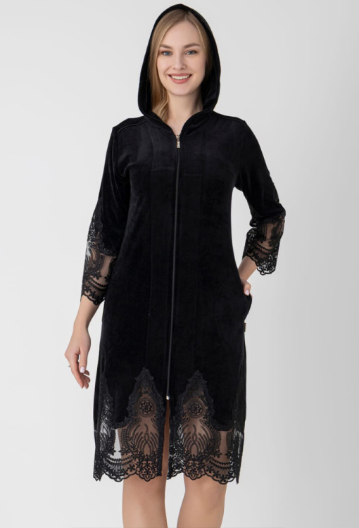 Елегантний жіночий халат від турецького бренду Nusa. Халат виконаний з м'якого та якісного велюру чорного кольору, з рукавами 7/8 та капюшоном. Модель прямого силуету, завдовжки трохи нижче колін й зі зручними бічними кишенями, застібається на блискавку. Рукави та низ виробу прикрашені широкими вставками із розкішного вирізного мережива. Халат дуже гарний та зручний, ідеальний для домашніх затишних вечорів та прохолодного ранку, а також може бути корисним подарунком коханій та близькій людині.