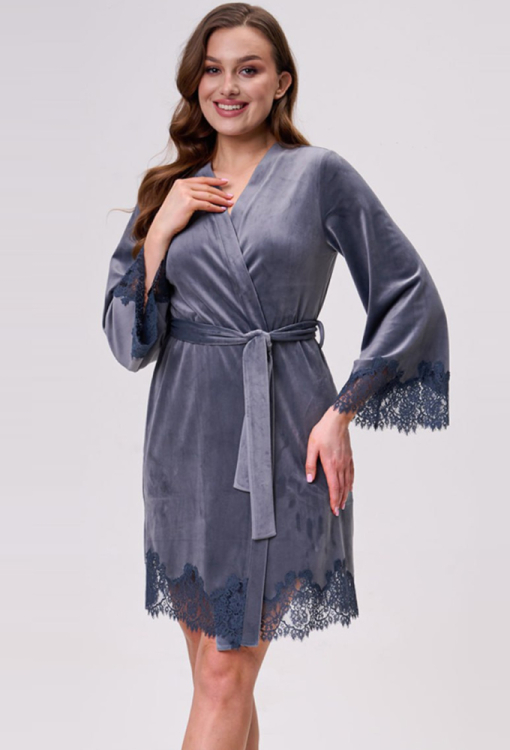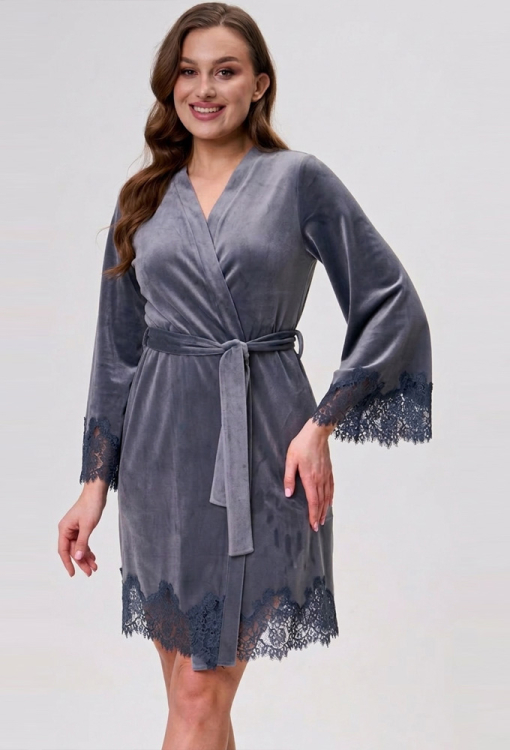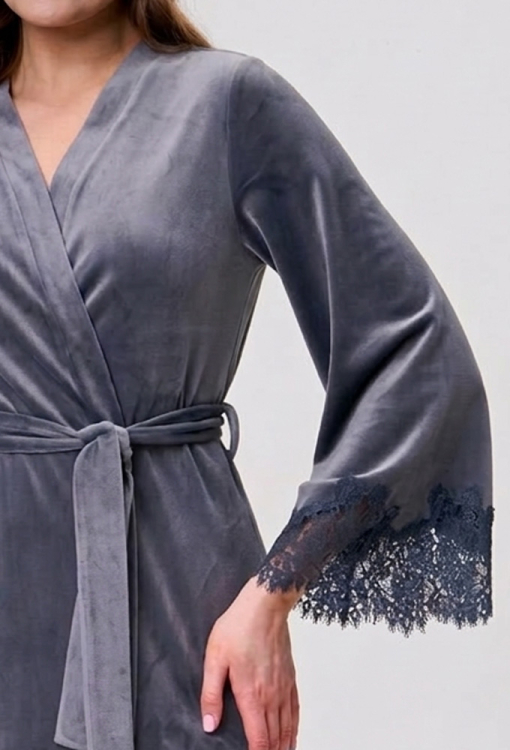 Елегантний жіночий халат від українського бренду Shato. Халат виконаний з якісного та м'якого велюру сірого кольору, з широкими рукавами 7/8 та довжиною вище колін. Модель зі зручними бічними кишенями зав'язується на запах за допомогою пояса, рукава та низ прикрашені широкими мереживними вставками з квітковим візерунком. Халат дуже красивий і комфортний, додасть привабливості домашньому образу, а також буде чудовим подарунком для коханої чи близької людини.