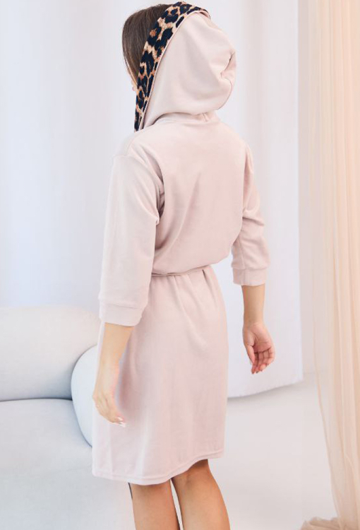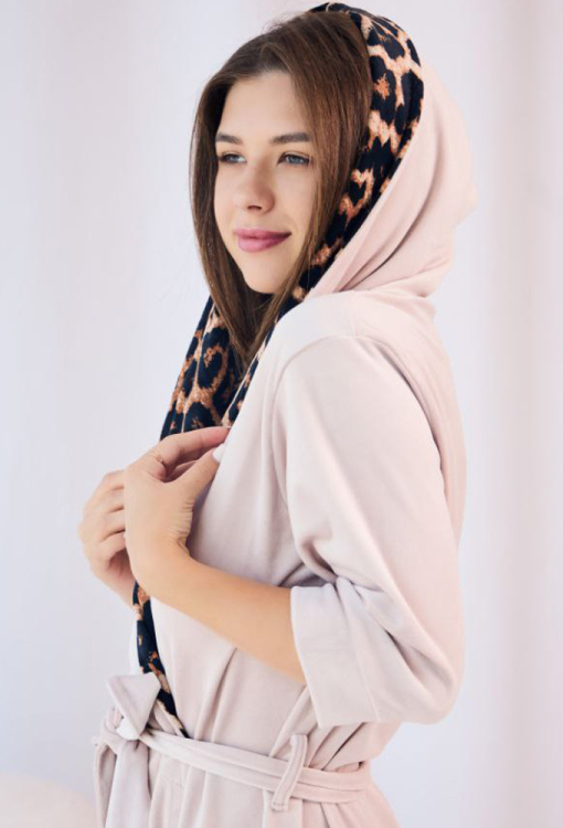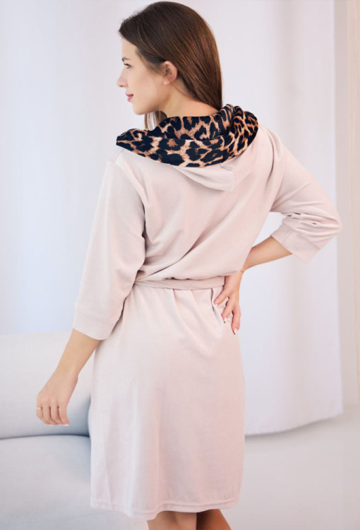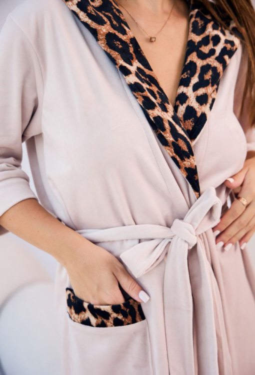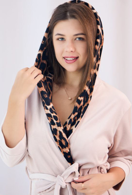Легкий та приємний до тіла жіночий халат від українського бренду Tomiko. Халат виконаний з м'якого та якісного велюру кольору мокко, вільного силуету та довжиною вище колін. Модель з рукавами 3/4 на вільних манжетах, капюшоном та зручною накладною кишенею, зав'язується на запах за допомогою пояса та внутрішніх зав'язок. Капюшон виробу всередині оброблений велюром з леопардовим принтом, кишеня прикрашена вставкою в тон обробки капюшона. Халат красивий і дуже комфортний, забезпечить тепло та затишок у будь-яку пору року, також може бути чудовим подарунком коханій та близькій людині!