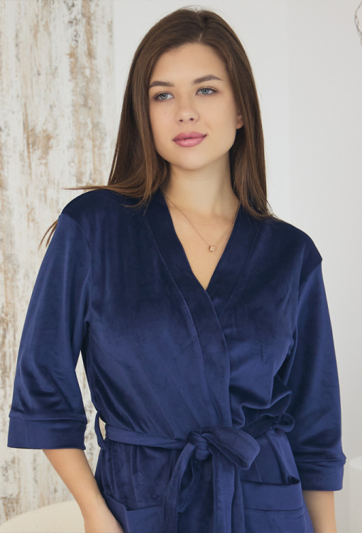 Стильний жіночий халат від українського бренду Tomiko. Халат виконаний з м'якого та якісного велюру синього кольору, вільного силуету та довжиною трохи нижче колін. Модель з рукавами 3/4 та двома накладними кишенями, зав'язується на запах за допомогою пояса. Рукави виробу оброблені вільними манжетами. Халат дуже красивий і комфортний, ідеальний варіант для спа, ранкової кави та вечірнього відпочинку вдома, також може бути чудовим й корисним подарунком коханій та близькій людині!