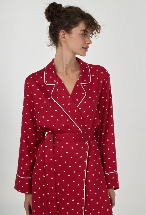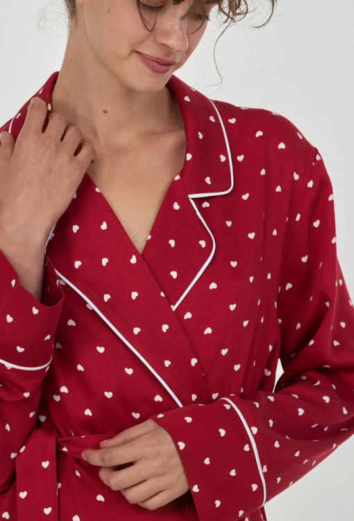 Яскравий жіночий халат із колекції Red Love від українського бренду Ellen. Халат виконаний з якісної та м'якої віскози червоного кольору в принт із дрібних білих сердець, вільного силуету та довжиною нижче колін. Модель із довгими рукавами та відкладним коміром зав'язується на запах за допомогою пояса. Комір, борти та рукави виробу прикрашені тонким кантом білого кольору. Халат дуже красивий і комфортний, ідеальний варіант для домашнього затишку, також може бути чудовим подарунком коханій або близькій людині.