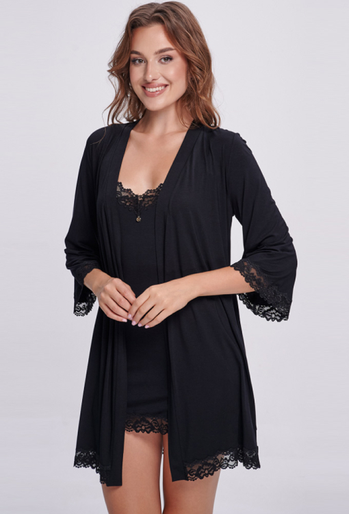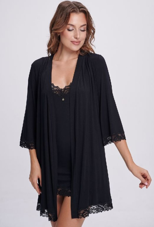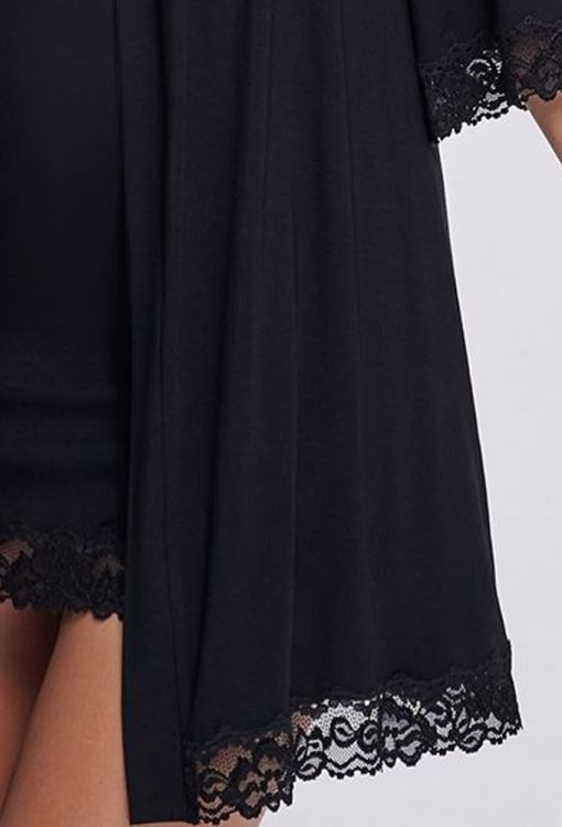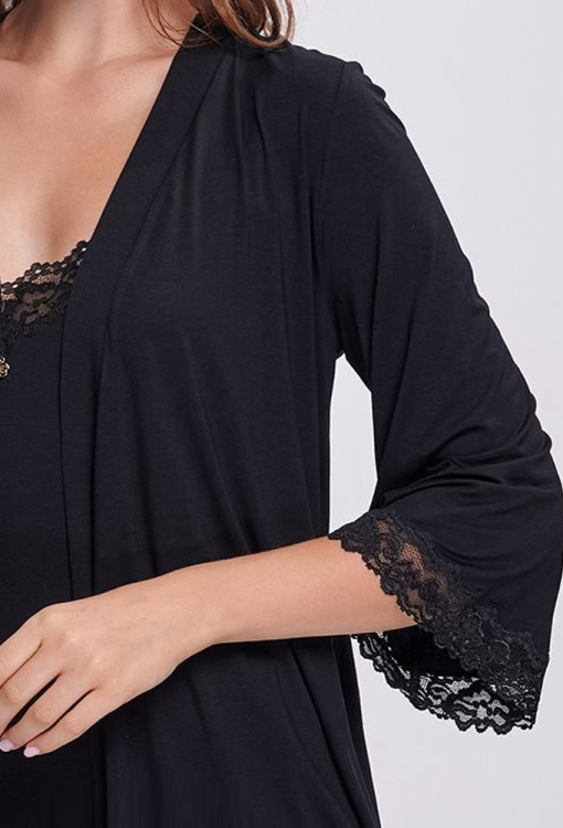 Привабливий жіночий халат від українського бренду Shato. Халат виконаний з якісної та м'якої віскози чорного кольору, класичного крою та з рукавами 3/4. Модель завдовжки вища за коліна, зав'язується на запах за допомогою пояса, на рукавах та внизу прикрашена вставками з ніжного ажурного мережива. Халат дуже красивий і комфортний, ідеальний для домашнього користування, також може бути чудовим подарунком коханій або близькій людині.