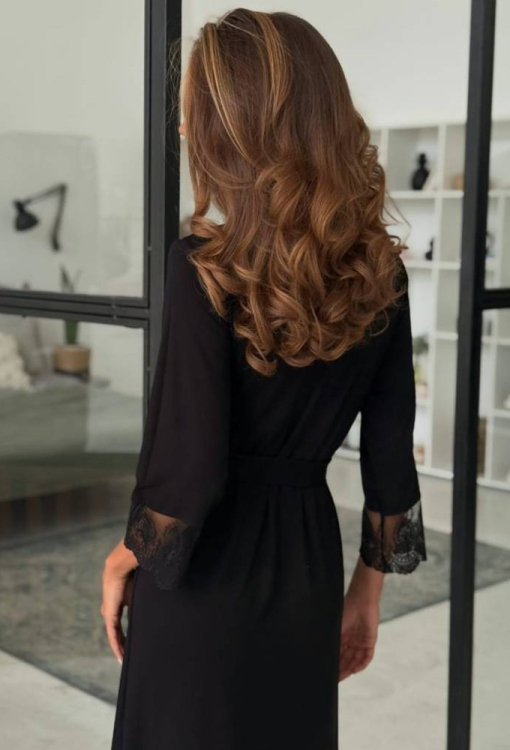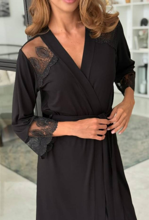 Розкішний жіночий халат від українського бренду Violet delux. Халат виконаний з м'якої та якісної віскози чорного кольору, з рукавами 3/4 та довжиною трохи вище колін. Модель зав'язується на запах за допомогою пояса, рукава та плечі прикрашені вставками з ажурного мережива з вишивкою. Халат дуже красивий і комфортний, буде ідеальним варіантом для домашнього використання, а також чудовим подарунком коханій та близькій людині.