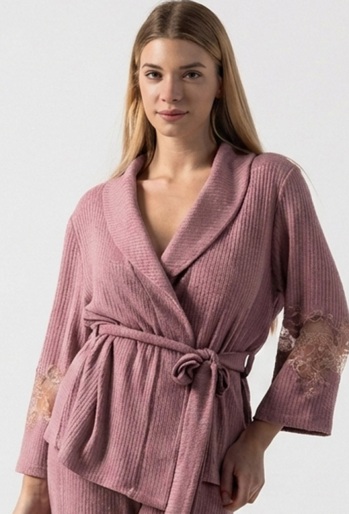 Розкішний жіночий домашній костюм Ash Rose від українського бренду Felena. Костюм виконаний з м'якого та якісного трикотажу в рубчик, темно-рожевого кольору, складається з кардигану та вільних штанів. Кардиган з рукавами 3/4 та коміром шаль, зав'язується на запах за допомогою пояса, штани з м'якою гумкою в поясі. Рукави моделі та штани внизу прикрашені фігурними вставками з легкого ажурного мережива. Костюм дуже красивий і комфортний, ідеальний для домашнього затишного проведення часу, а також може бути чудовим подарунком коханій та близькій людині.