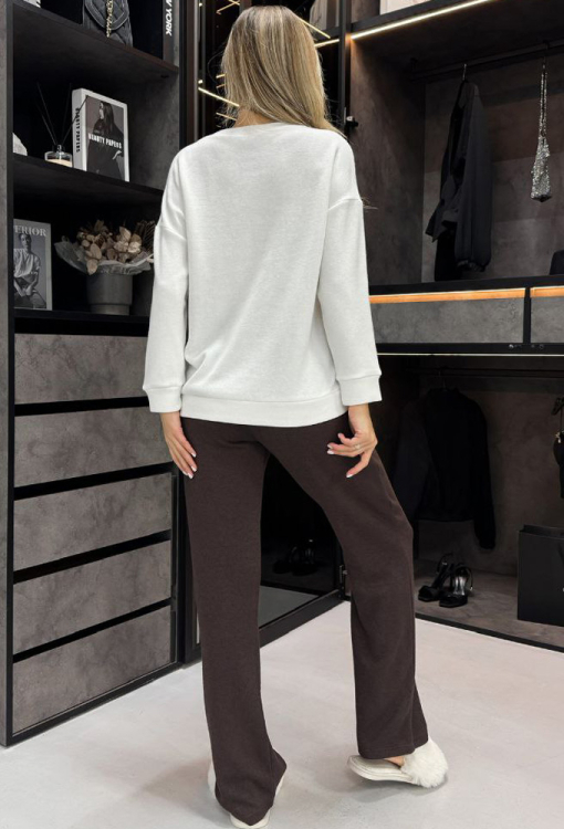 Теплий та комфортний жіночий костюм від українського бренду Julia Ulich. Костюм виконаний з м'якої та якісної ангори, складається з кофти білого кольору та шоколадних штанів. Кофта вільного силуету, з довгими рукавами, заниженим плечовим швом та V-подібним вирізом горла, на рукавах та внизу оброблена манжетами. Штани прямого крою, з м'якою гумкою в поясі та зручними бічними кишенями. Костюм дуже красивий і приємний до тіла, ідеальний вибір для домашнього затишку та стилю, також може бути корисним подарунком коханій та близькій людині!
