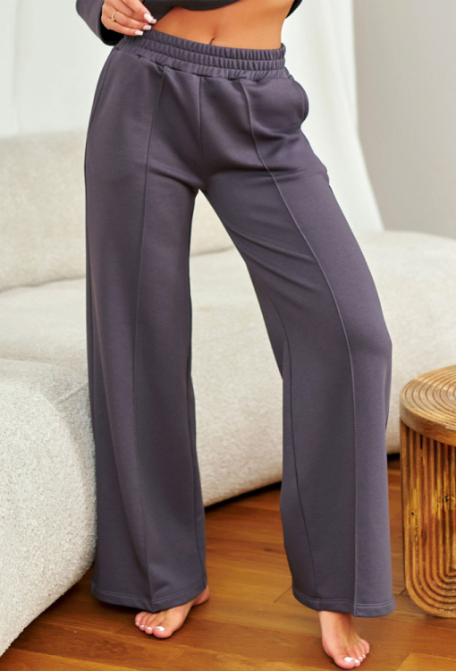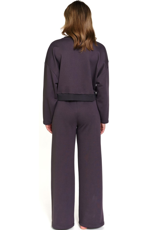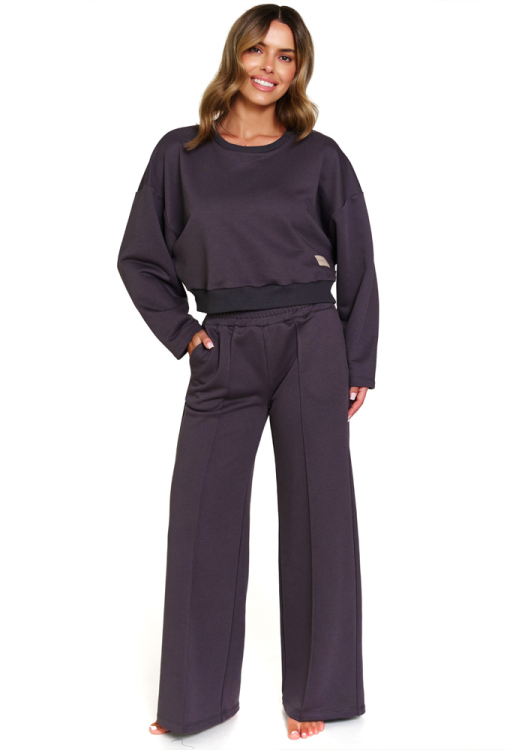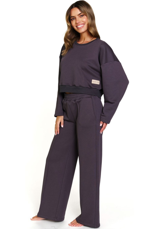 Стильний жіночий костюм від польського бренду Henderson Ladies. Костюм виконаний з м'якої та якісної бавовни графітового кольору, складається з укороченої кофти та вільних штанів. Кофта з довгими рукавами, заниженим плечовим швом та круглим вирізом горла, рукава, горловина та низ виробу оброблені трикотажними манжетами. Штани з м'якою гумкою в поясі та зручними бічними кишенями, спереду прикрашені фіксованими стрілками. Костюм дуже красивий і комфортний, ідеальний для домашнього затишку в холодну пору, а також може бути корисним подарунком коханій та близькій людині.