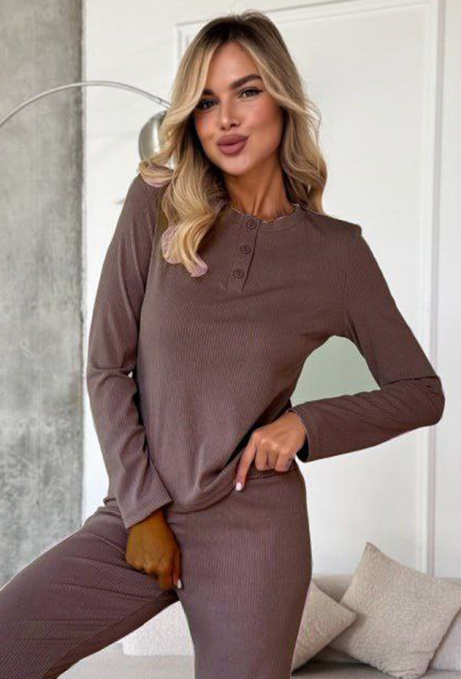 Комфортний жіночий костюм від українського бренду Julia Ulich. Костюм виконаний з м'якої та якісної бавовни в рубчик шоколадного кольору, складається з кофти прямого силуету та штанів вільного крою. Кофта з довгими рукавами та круглим вирізом горла, вгорі застібається на три ґудзики. Штани зі зручною посадкою та м'якою гумкою в поясі. Костюм дуже красивий і приємний до тіла, підкреслить стиль і додасть впевненості домашньому образу, також може бути чудовим подарунком коханій та близькій людині!
