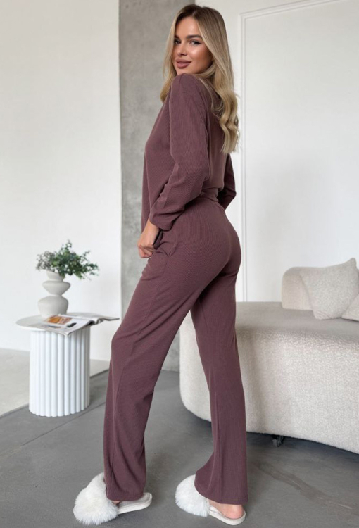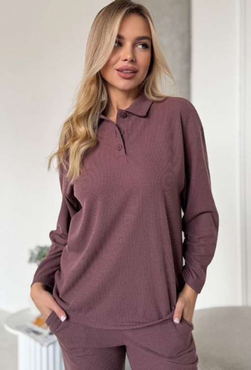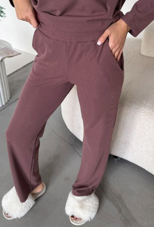 Чудовий жіночий костюм від українського бренду Julia Ulich. Костюм виконаний з м'якої та якісної бавовни в рубчик шоколадного кольору, складається з кофти зі штанами вільного силуету. Кофта з довгими рукавами та відкладним коміром, вгорі застібається на три ґудзики. Штани зі зручною посадкою, м'якою гумкою в поясі та зручними кишенями. Костюм дуже красивий і приємний до тіла, підкреслить стиль і додасть впевненості домашньому образу, також може бути корисним подарунком коханій та близькій людині!