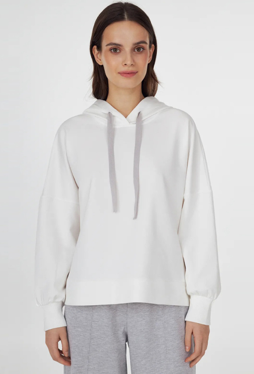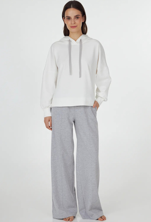 Стильний жіночий костюм із колекції Amber від українського бренду Ellen. Костюм виконаний з якісної та м'якої двонитки, складається з кофти білого кольору та сірих штанів. Кофта вільного крою, з капюшоном, довгими рукавами на манжетах та заниженим плечовим швом, ширина капюшона регулюється за допомогою внутрішнього шнурка. Штани також вільного крою, з м'якою гумкою в поясі та зручними бічними кишенями, спереду оброблені фіксованими стрілками. Костюм дуже красивий і комфортний, буде чудовим одягом для дому або корисним подарунком коханій та близькій людині!