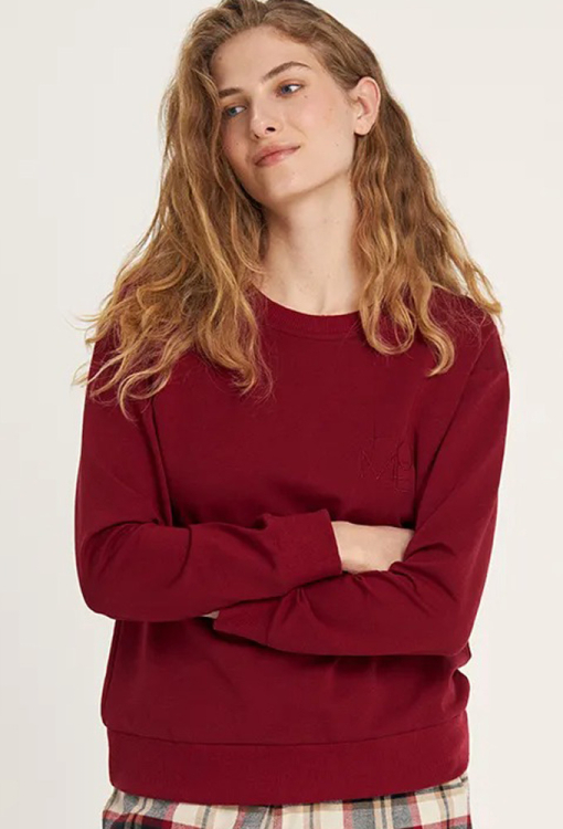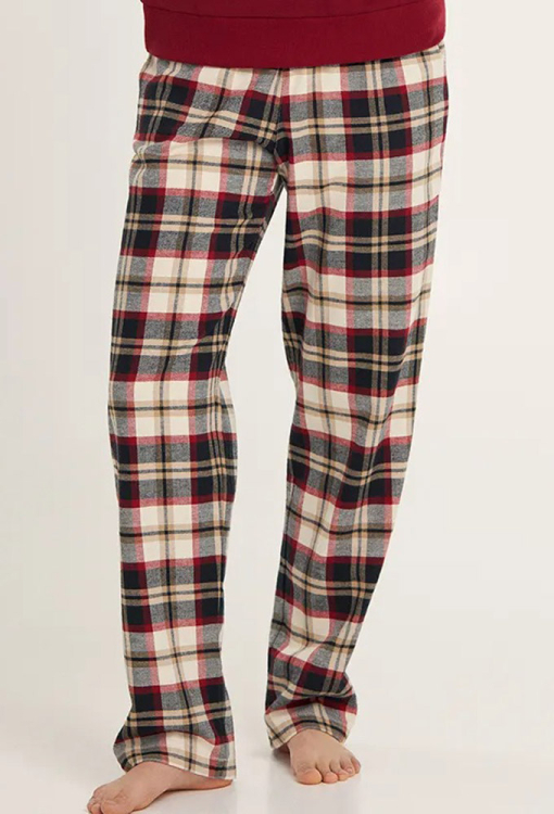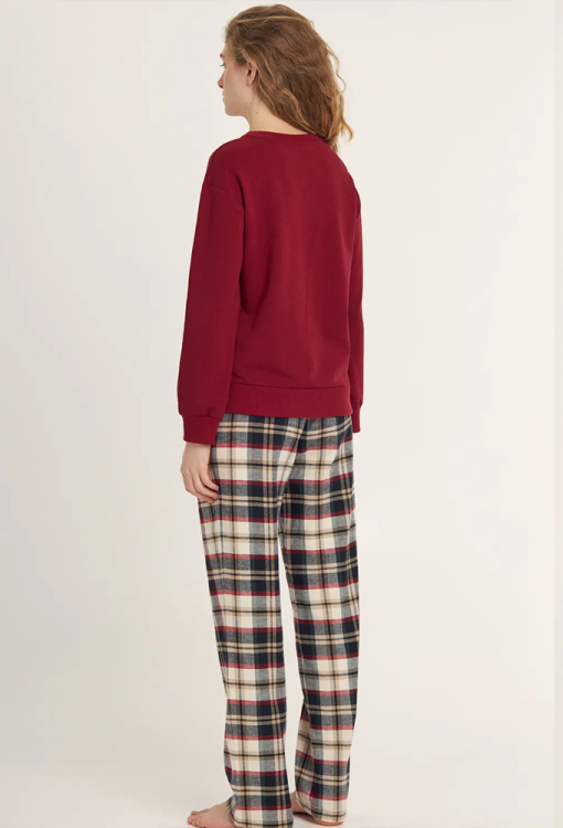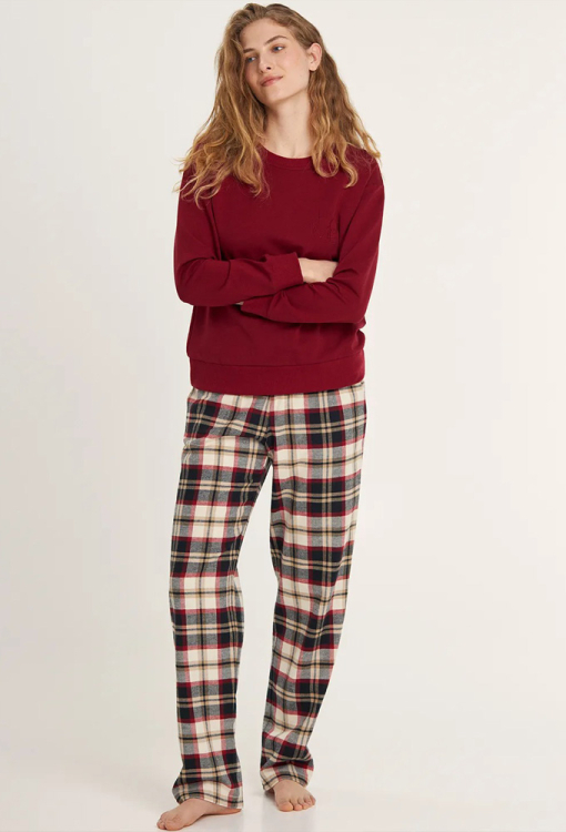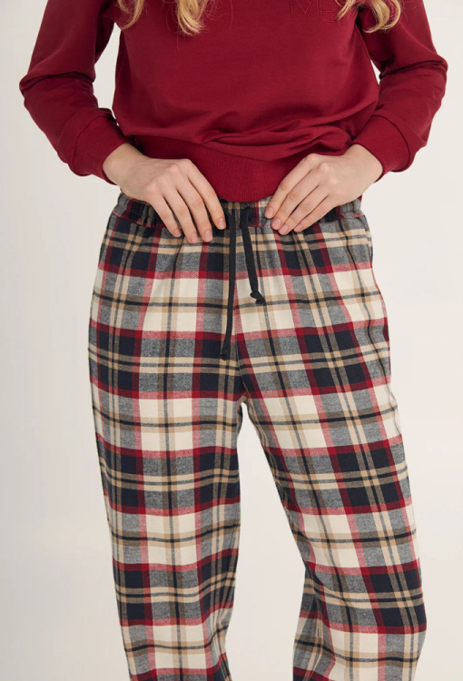 Теплий жіночий костюм із колекції Meirlot від українського бренду Ellen. Костюм виконаний з якісного та м'якого матеріалу, складається з кофти двонитки бордового кольору та байкових штанів у бежеву та чорну клітинку з бордовим акцентом. Кофта вільного крою, з довгими рукавами на манжетах, заниженим плечовим швом та круглим вирізом горла, низ та горловина моделі оброблені зручними манжетами. Штани прямого крою та з м'якою гумкою в поясі, регулюються по ширині за допомогою внутрішнього шнурка. Костюм дуже красивий і комфортний, буде чудовим одягом для дому або корисним подарунком коханій та близькій людині!