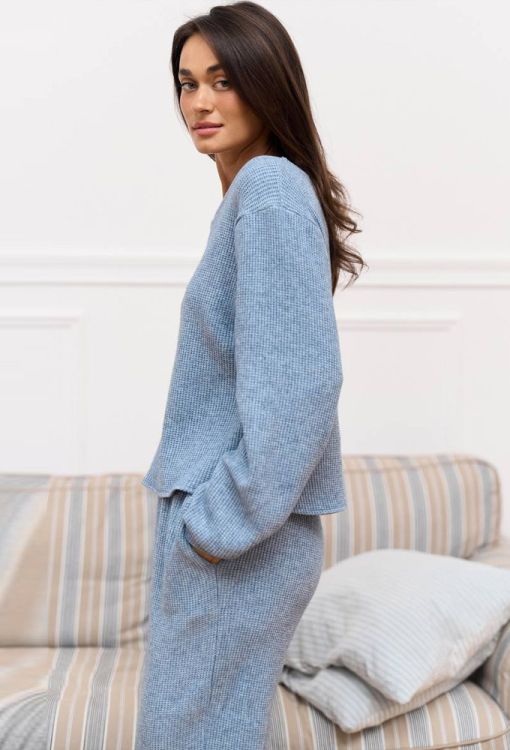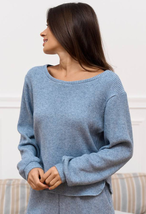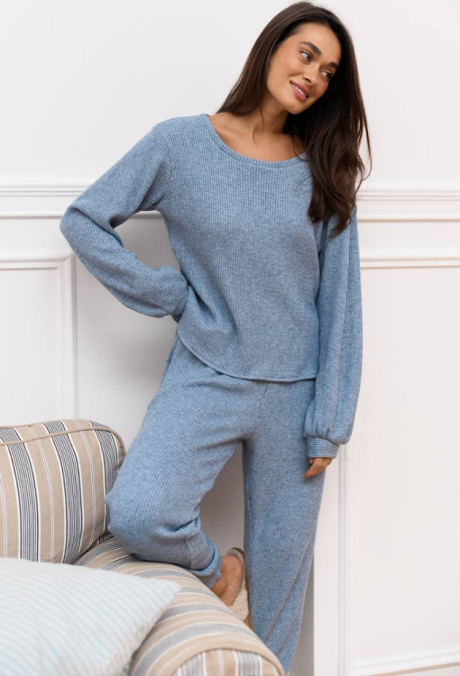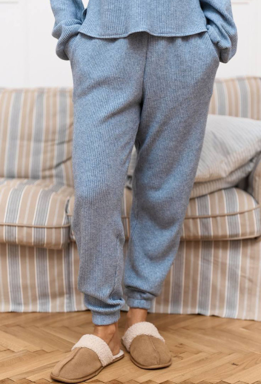 Чудовий жіночий костюм від українського бренду DaLi. Костюм виконаний з якісного та м'якого трикотажу з в'язаною фактурою в рубчик синього кольору, складається з кофти прямого силуету та штанів з манжетами. Кофта з довгими рукавами та круглим вирізом горла, рукави оброблені манжетами, з боків унизу закруглені розрізи. Штани зі зручною посадкою та м'якою гумкою в поясі, з боків розташовані зручні кишені. Костюм дуже гарний та комфортний, ідеальний для затишного домашнього відпочинку, а також може бути чудовим подарунком коханій та близькій людині.