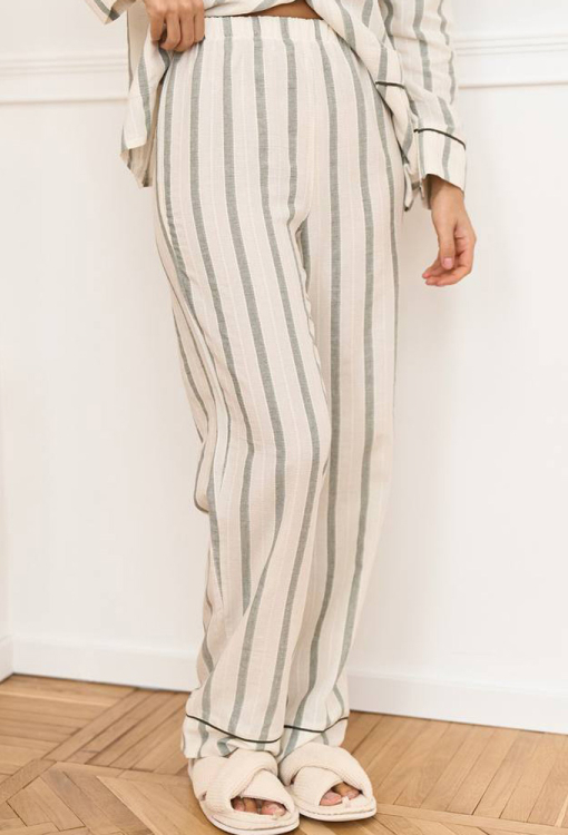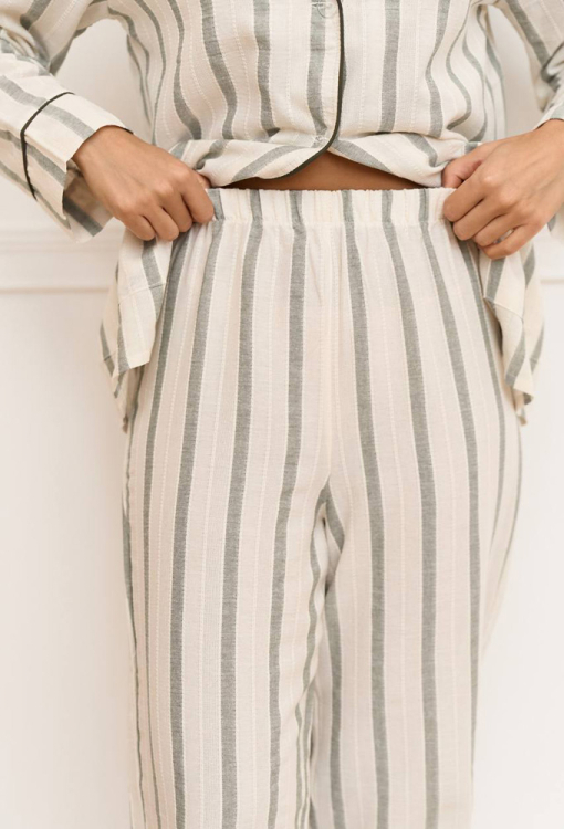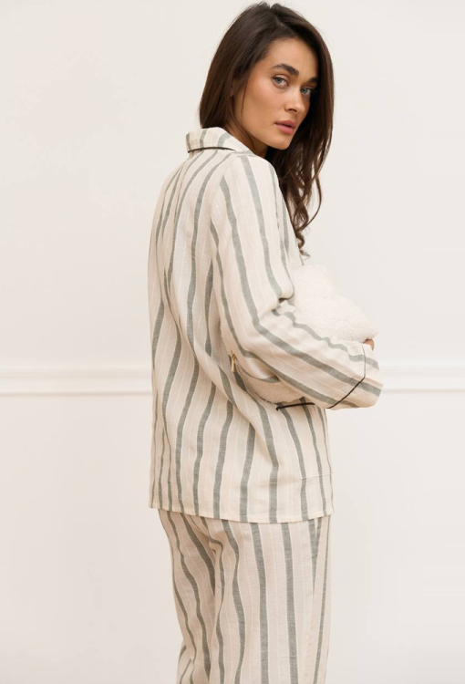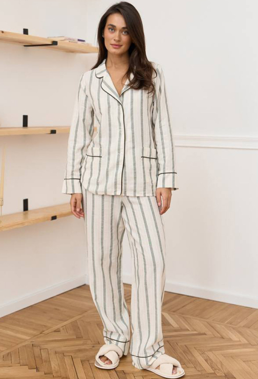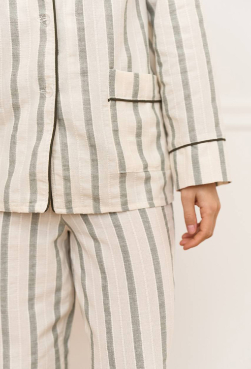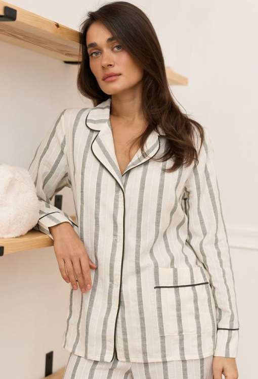 Класичний жіночий костюм від українського бренду DaLi. Костюм виконаний з якісного та м'якого трикотажу, кремового кольору в смугастий принт кольору хакі, складається з сорочки зі штанами прямого силуету. Сорочка з довгими рукавами, відкладним коміром та двома накладними кишенями, застібається на ґудзики. Комір, полиці, рукави та кишені моделі прикрашені тонким кантом чорного кольору. Штани зі зручною посадкою та м'якою гумкою в поясі, внизу оброблені контрастним кантом. Костюм дуже гарний та комфортний, ідеальний для затишного домашнього відпочинку, а також може бути чудовим подарунком коханій та близькій людині.