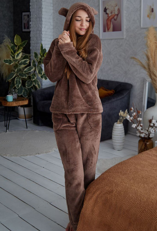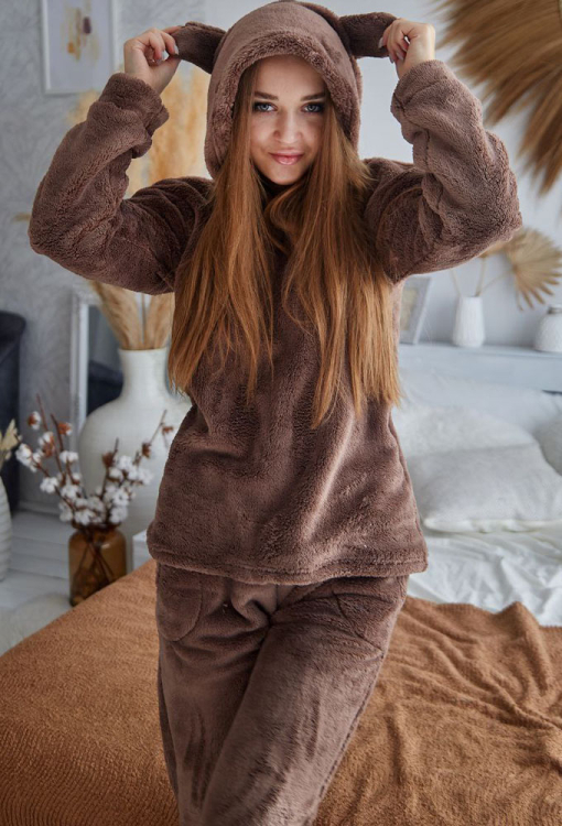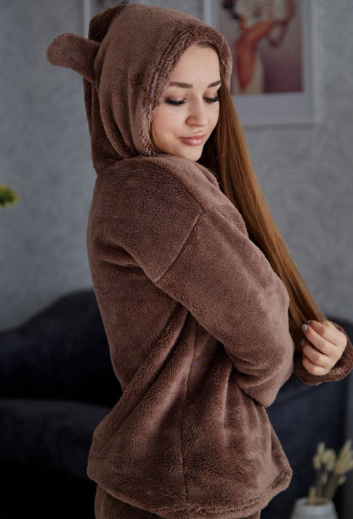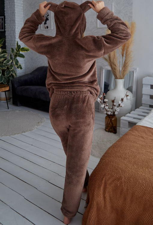 Теплий жіночий костюм від українського бренду Tomiko. Костюм виконана з м'якого та якісного велсофту шоколадного кольору, складається з кофти та штанів прямого крою. Кофта з довгими рукавами, заниженим плечовим швом та капюшоном, рукави моделі оброблені вільними манжетами, капюшон прикрашений кумедними вушками. Штани з м'якою гумкою в поясі та вільними манжетами, з боків розташовані зручні кишені. Костюм красивий та затишний, приємно зігріває та дозволяє розслабитися після насиченого дня, також може бути чудовим подарунком близьким людям.