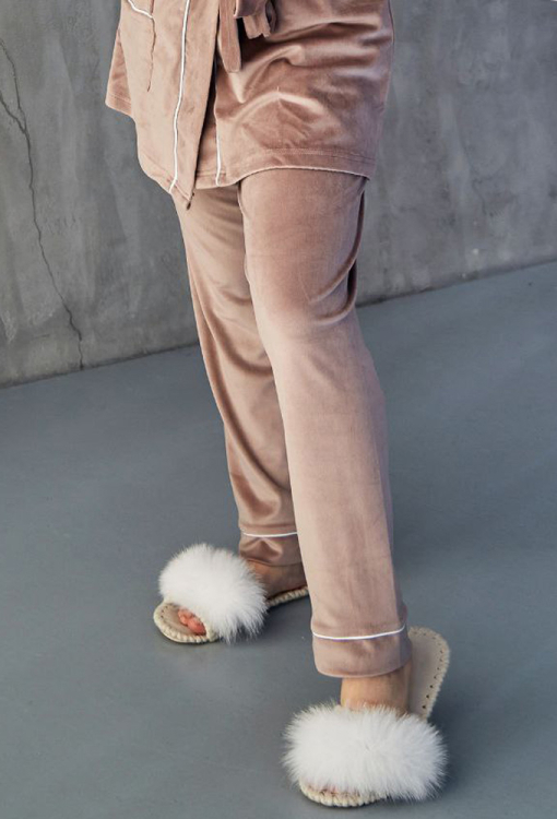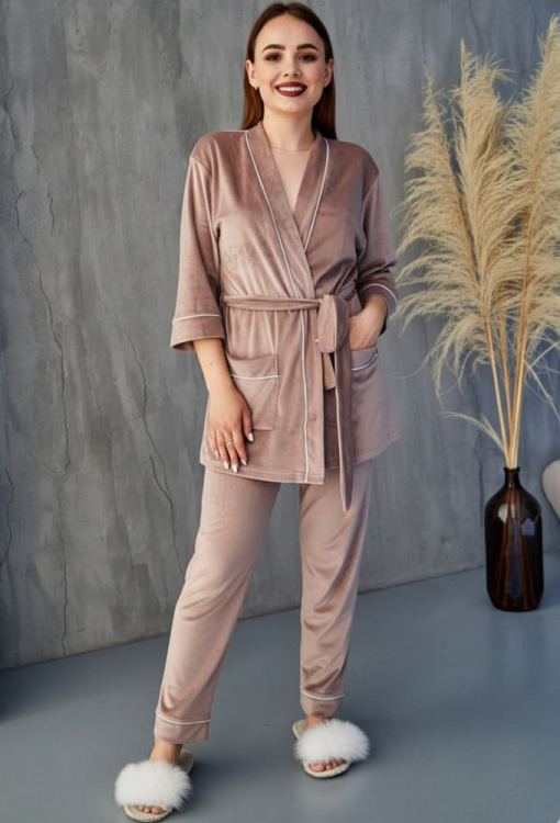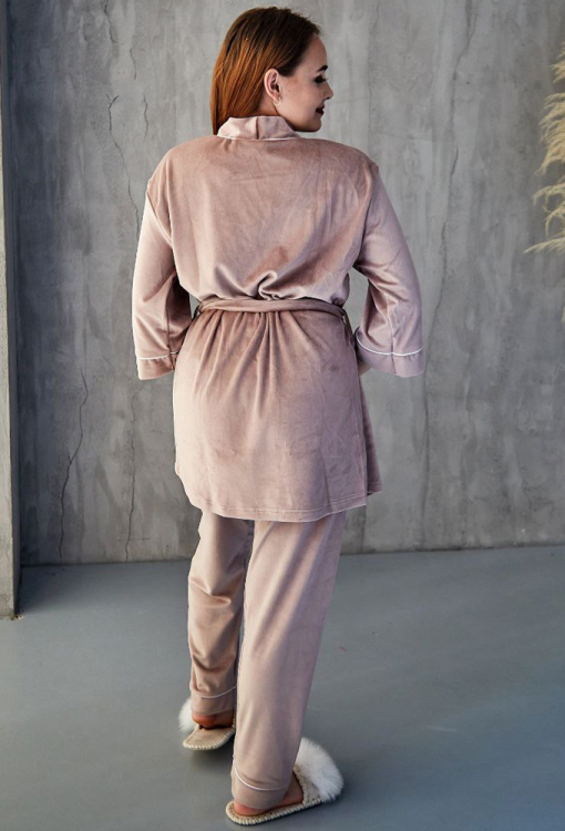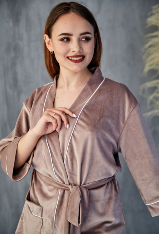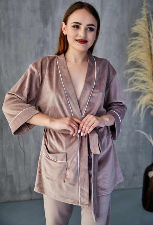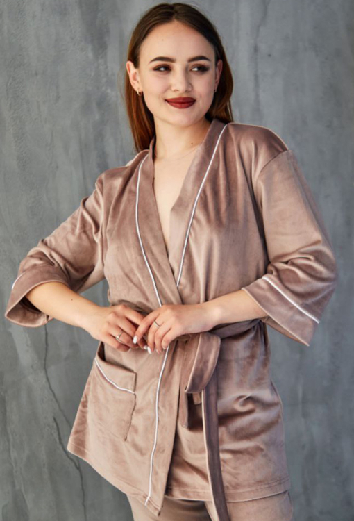 Затишний жіночий костюм від українського бренду Tomiko. Костюм виконана з м'якого та якісного велюру кольору капучино, складається з короткого халата та штанів прямого крою. Халат вільного силуету з рукавами 3/4 та зручною накладною кишенею, зав'язується на запах за допомогою пояса. Виріз, борти, рукави та кишеня моделі прикрашені тонким кантом білого кольору. Штани з м'якою гумкою в поясі та контрастним кантом унизу, створюють комфортну посадку і не сковують рухів. Костюм стильний та затишний, приємно зігріває та дозволяє розслабитись після насиченого дня, також може бути чудовим подарунком близьким людям.