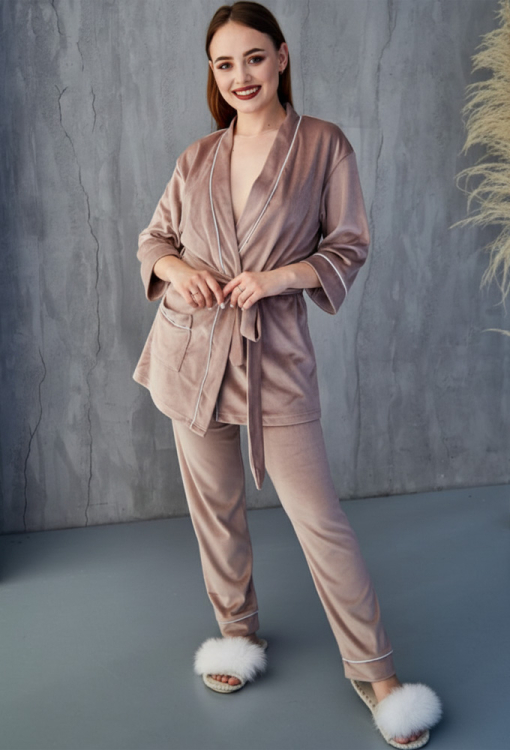 Затишний жіночий костюм від українського бренду Tomiko. Костюм виконана з м'якого та якісного велюру кольору капучино, складається з короткого халата та штанів прямого крою. Халат вільного силуету з рукавами 3/4 та накладною кишенею, зав'язується на запах за допомогою пояса і зав'язок всередині. Виріз, борти, рукави та кишеня моделі прикрашені тонким кантом білого кольору. Штани з м'якою гумкою в поясі та контрастним кантом унизу, створюють зручну посадку і не сковують рухів. Костюм стильний і комфортний, приємно зігріває та дозволяє розслабитись після насиченого дня, також може бути чудовим подарунком близьким людям.