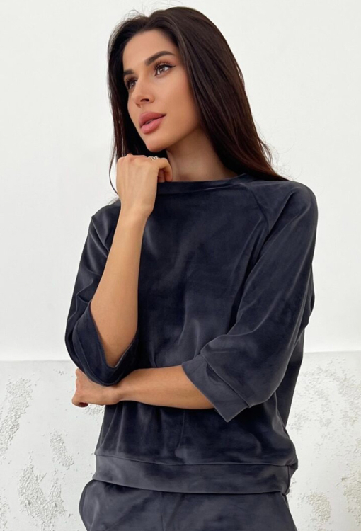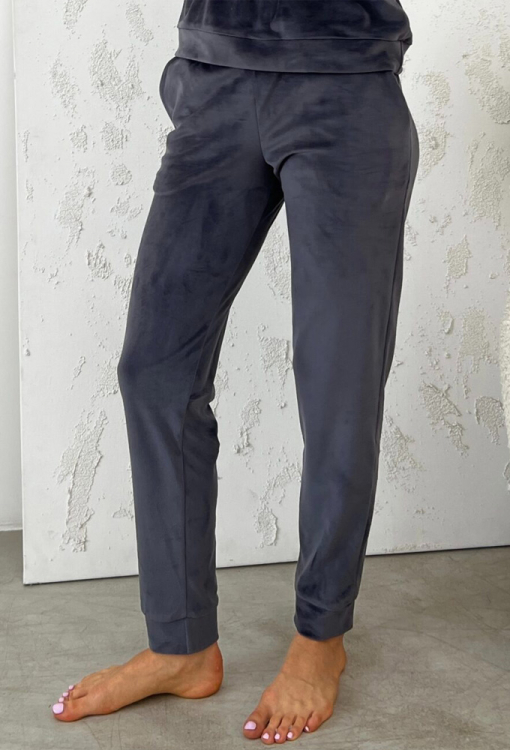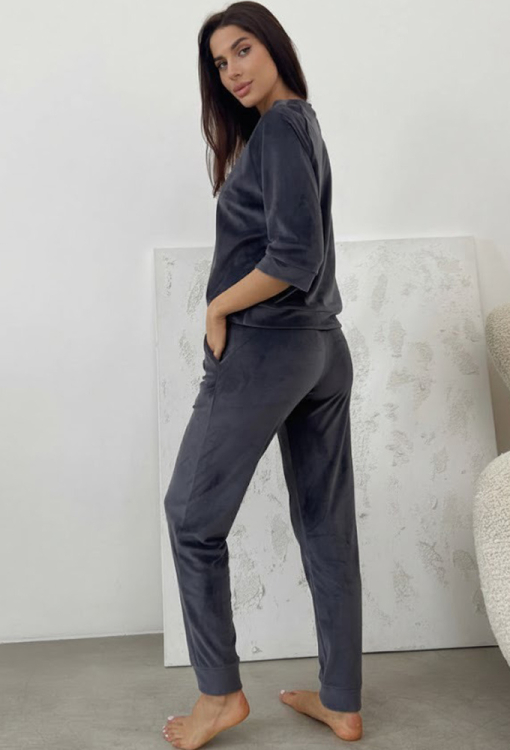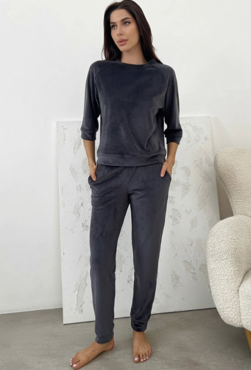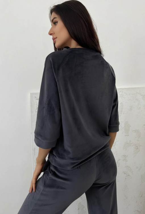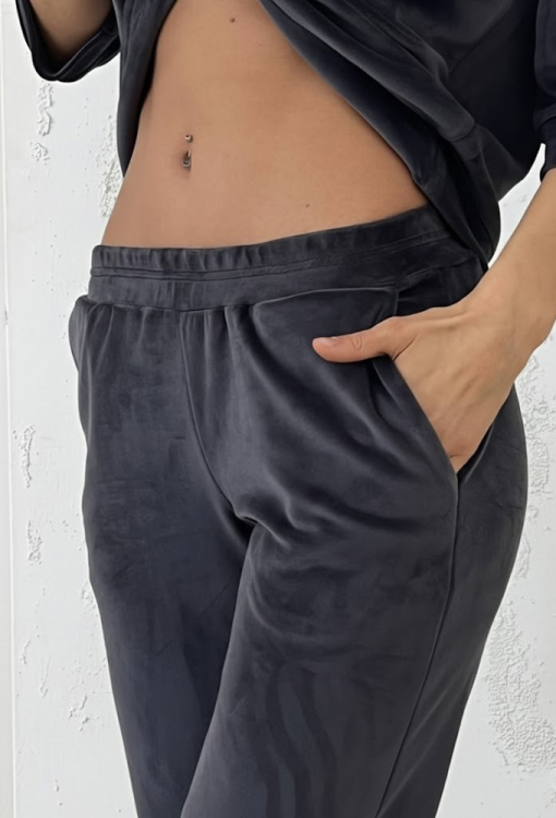 Зручний жіночий костюм від українського бренду Julia Ulich. Костюм виконаний з м'якого та якісного велюру графітового кольору, складається з кофти прямого силуету та штанів на манжетах. Кофта з рукавами 3/4 та круглим вирізом горла, рукави оброблені вільними манжетами. Штани з м'якою гумкою в поясі та зручними бічними кишенями. Костюм дуже красивий і приємний до тіла, підкреслить стиль і додасть впевненості домашньому образу, також може бути чудовим подарунком коханій та близькій людині!