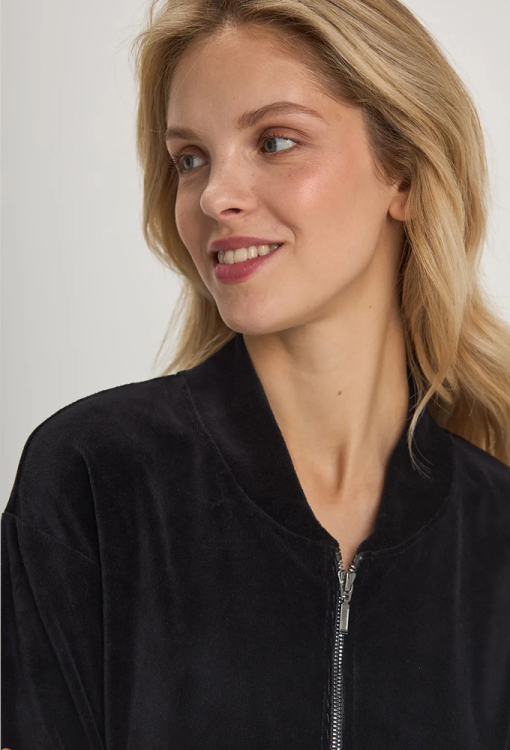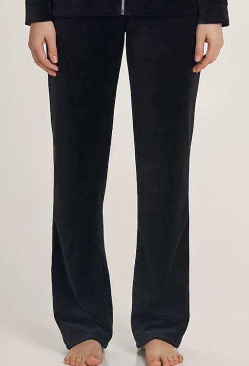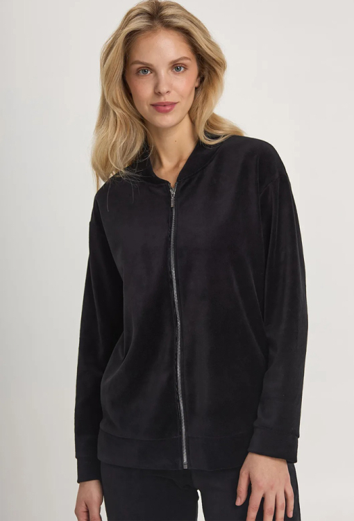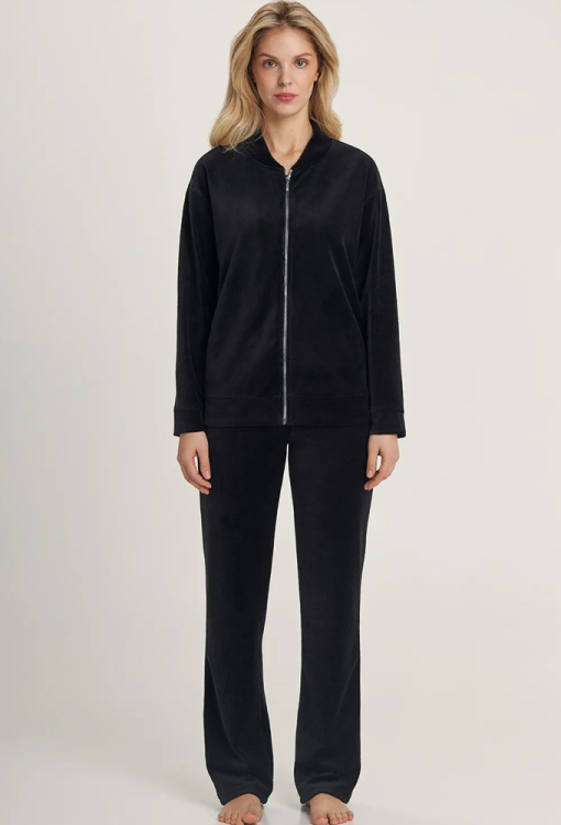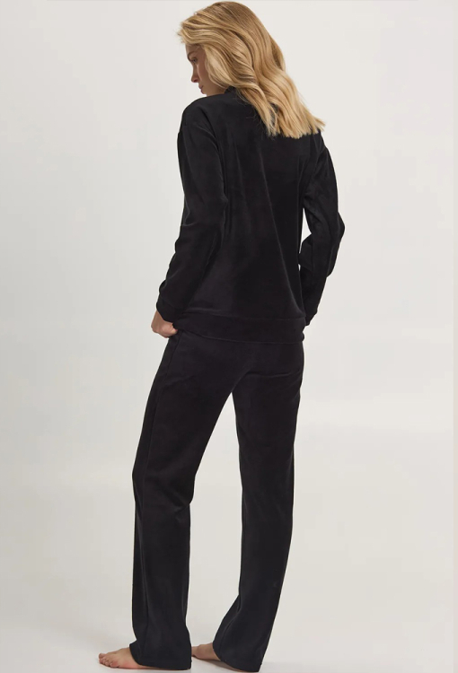 Стильний жіночий костюм із колекції Margo від українського бренду Ellen. Костюм виконаний з м'якого та якісного велюру чорного кольору, складається з кофти зі штанами прямого силуету. Кофта з довгими рукавами й невеликим V-образним вирізом горла, застібається на блискавку. Горловина, рукави та низ моделі оброблені зручними манжетами, штани з м'якою гумкою у поясі. Костюм дуже красивий і комфортний, ідеальний для домашнього затишку холодними вечорами, а також може бути корисним подарунком коханій або близькій людині.