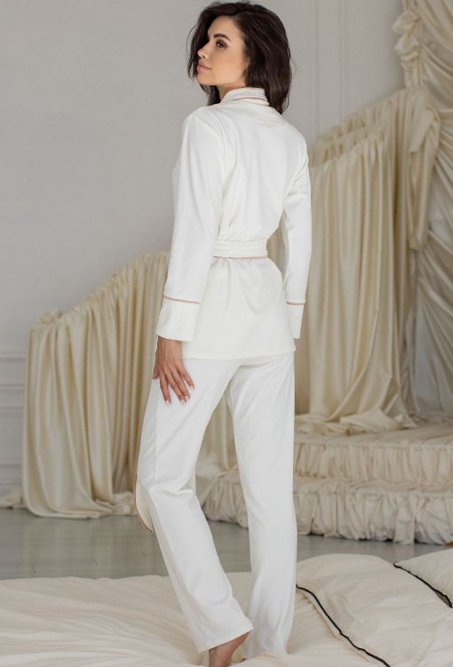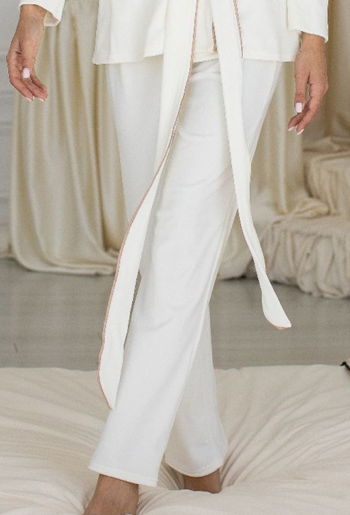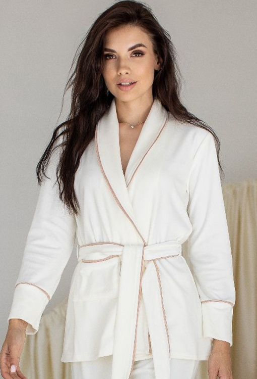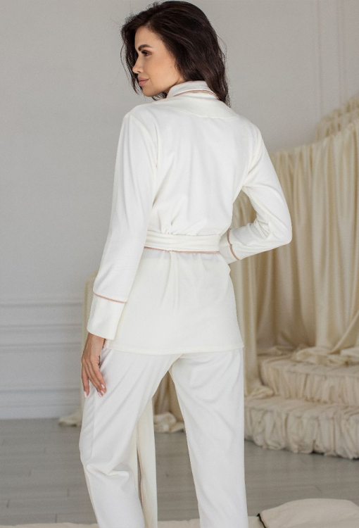 Елегантний жіночий костюм від українського бренду MiaNaGreen. Костюм виконаний з м'якого та якісного велюру кремового кольору, складається з жакета та штанів. Жакет вільного силуету, з довгими рукавами та коміром шаль, зав'язується на запах за допомогою довгого пояса. Внизу справа модель оброблена накладною кишенею, комір, полиці, рукави, кишеня та пояс прикрашені тонким кантом коричневого кольору. Штани прямого крою, зі зручною посадкою та м'якою гумкою в поясі. Костюм дуже красивий і приємний до тіла, ідеальний як домашній одяг чи подарунок!