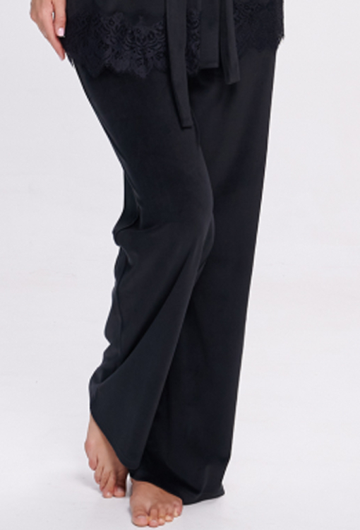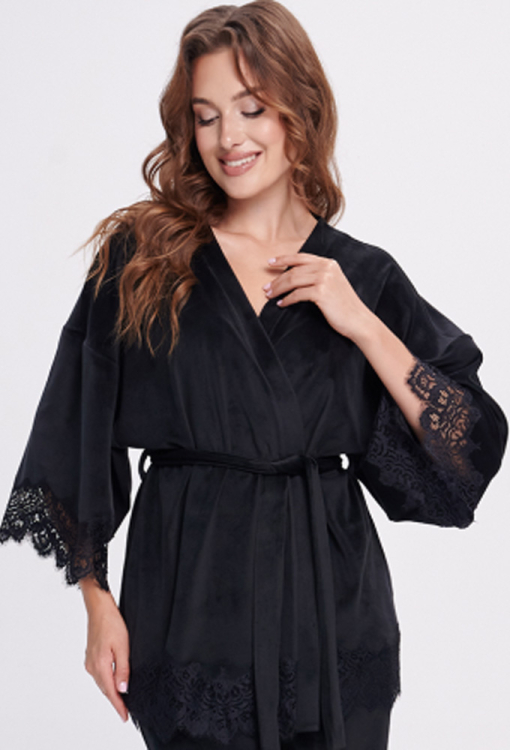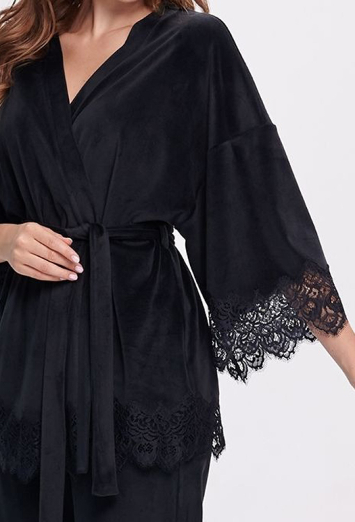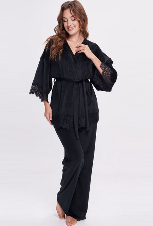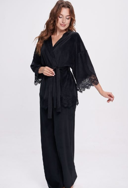 Шикарний жіночий костюм від українського бренду Shato. Костюм виконаний з якісного та м'якого велюру чорного кольору, складається з жакета вільного силуету та прямих штанів. Жакет із рукавами 7/8 та заниженою плечовою лінією, зав'язується на запах за допомогою пояса. Рукави та низ моделі прикрашені вставками з ажурного мережива. Штани з м'якою гумкою в поясі та зручними бічними кишенями. Костюм дуже красивий і комфортний, дозволить створити елегантний домашній образ, також може бути чудовим подарунком коханій та близькій людині.