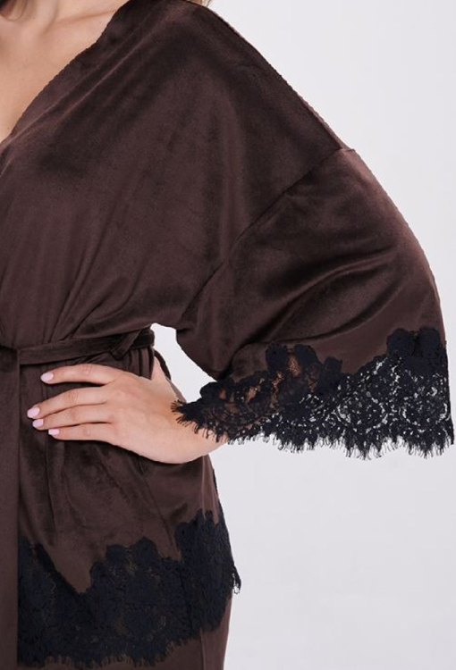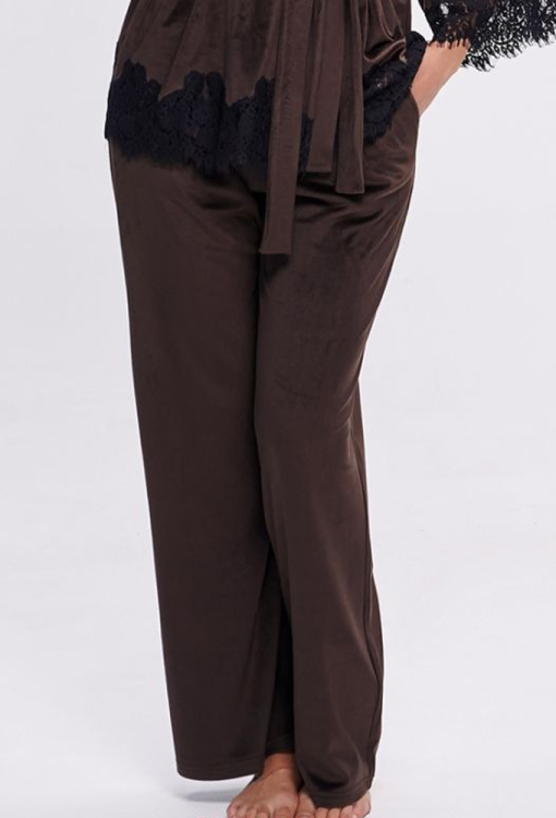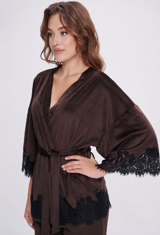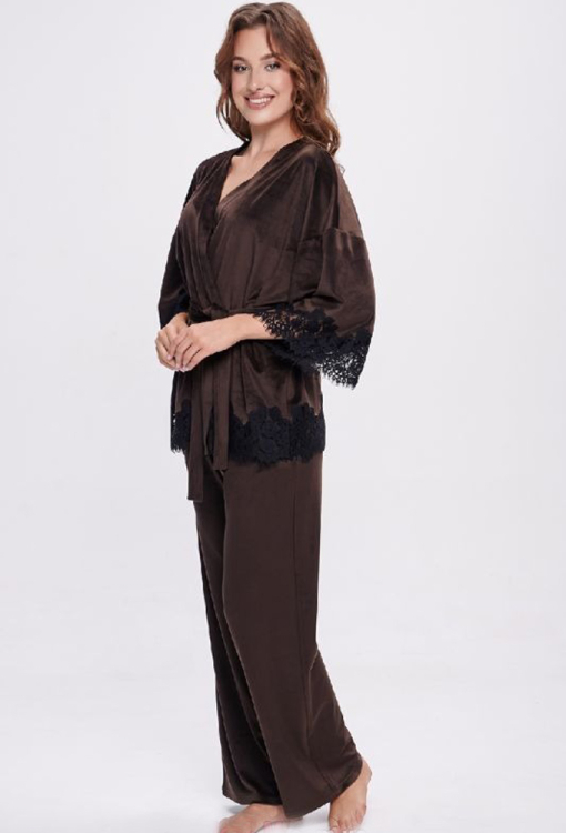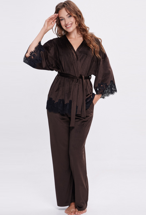 Шикарний жіночий костюм від українського бренду Shato. Костюм виконаний з якісного та м'якого велюру коричневого кольору, складається з жакета вільного силуету та прямих штанів. Жакет із рукавами 7/8 та заниженою плечовою лінією, зав'язується на запах за допомогою пояса. Рукави та низ моделі прикрашені вставками з ажурного мережива чорного кольору. Штани з м'якою гумкою в поясі та зручними бічними кишенями. Костюм дуже красивий і комфортний, дозволить створити елегантний домашній образ, також може бути чудовим подарунком коханій та близькій людині.