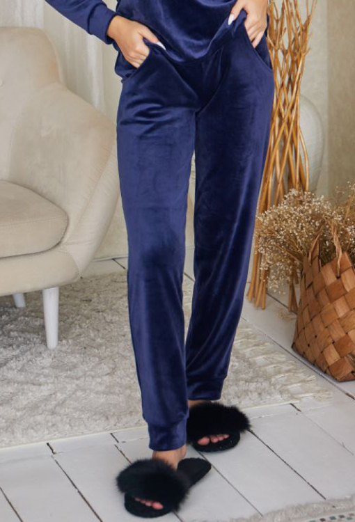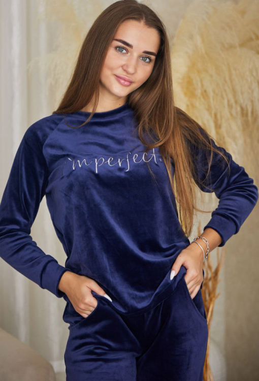 Комфортний жіночий костюм від українського бренду Tomiko створений для затишку та щоденного користування. Костюм виконаний з м'якого та якісного велюру темно-синього кольору, що дарує тепло та комфорт. Комплект складається з кофти прямого силуету та зручних штанів на манжетах. Кофта з довгими рукавами та круглим вирізом горла, прикрашена лаконічною вишивкою з написом, що надає образу стильного акценту. Штани з м'якою гумкою в поясі та зручними бічними кишенями, створюють зручну посадку, не сковують рухів. Костюм гарний та комфортний, ідеальний для дому та відпочинку, а також може стати чудовим подарунком для близької людини.