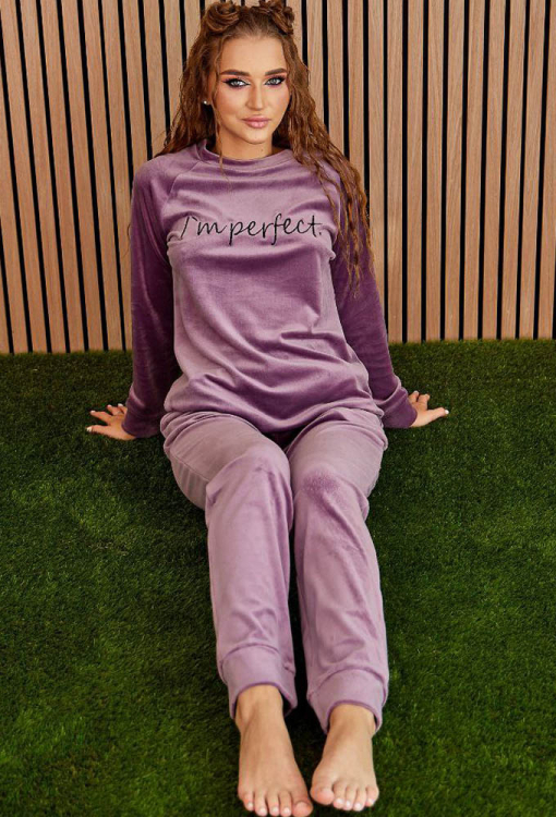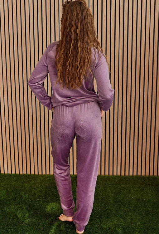 Комфортний жіночий костюм від українського бренду Tomiko створений для затишку та щоденного користування. Костюм виконаний з м'якого та якісного велюру лавандового кольору, що дарує тепло та комфорт. Комплект складається з кофти прямого силуету та зручних штанів на манжетах. Кофта з довгими рукавами та круглим вирізом горла, прикрашена лаконічною вишивкою з написом, що надає образу стильного акценту. Штани з м'якою гумкою в поясі та зручними бічними кишенями, створюють зручну посадку, не сковують рухів. Костюм гарний та комфортний, ідеальний для дому та відпочинку, а також може стати чудовим подарунком для близької людини.