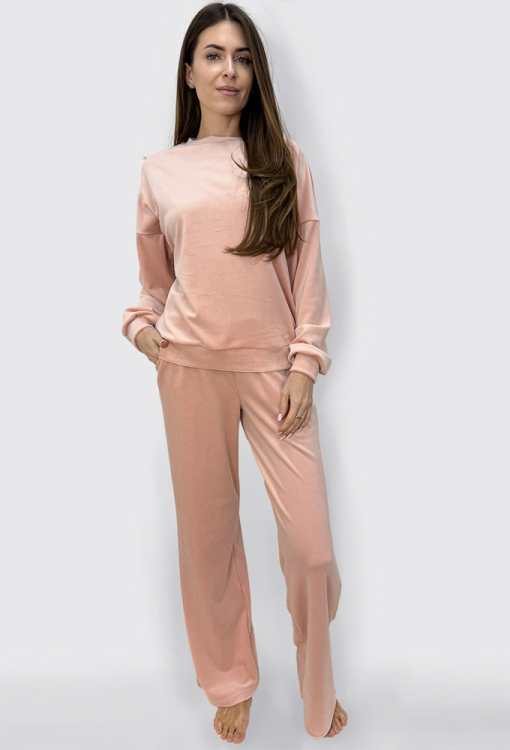 Стильний жіночий костюм від українського бренду Wiktoria. Костюм виконаний з якісного та м'якого велюру пудрового кольору, складається з кофти та штанів вільного силуету. Кофта з довгими рукавами, невеликим круглим вирізом горла та заниженим плечовим швом, на рукавах та внизу оброблена манжетами. Штани з м'якою гумкою в поясі та зручними бічними кишенями. Костюм дуже красивий і комфортний, ідеальний вибір для комфортного відпочинку вдома, або подарунка коханій та близькій людині.