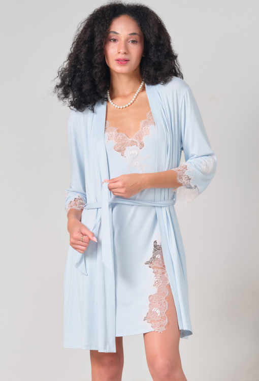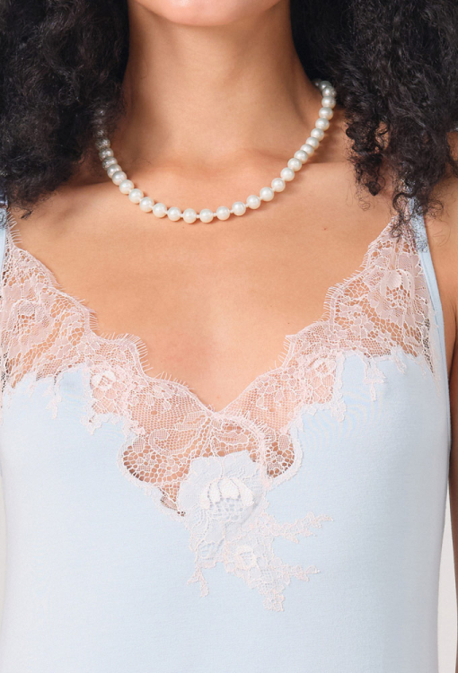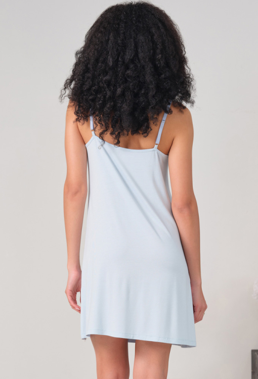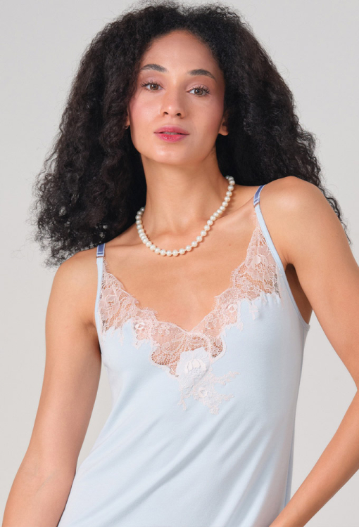 Ніжна нічна сорочка з колекції Core від італійського бренду Effetto. Сорочка виконана з м'якого та якісного бамбука блакитного кольору, прямого силуету та довжиною вище колін. Модель на тонких бретелях, що регулюються, та з V-подібним декольте, внизу зліва оброблена високим розрізом. Лінія вирізу та розріз виробу прикрашені фігурними вставками з мережива з квітковим мотивом кремового кольору. Нічна сорочка дуже гарна і комфортна, ідеальна для створення сексуального вечірнього образу, а також може бути чудовим подарунком коханій і близькій людині.