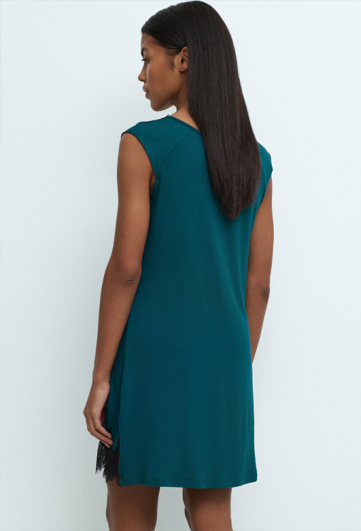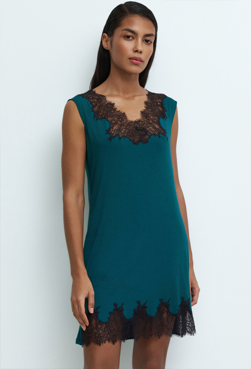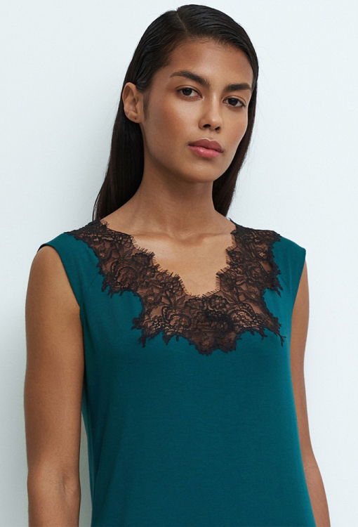 Елегантна нічна сорочка з колекції Core від італійського бренду Effetto. Сорочка виконана з м'якого та якісного бамбука зеленого кольору, прямого силуету та довжиною вище колін. Модель без рукавів та з V-подібним декольте, оформленим шикарним чорним мереживом з віями. Низ передньої полиці виробу прикрашений широкою вставкою з вирізного мережива з квітковим мотивом чорного кольору. Нічна сорочка дуже гарна і комфортна, ідеальна для сну і неспішного ранку вихідного дня, а також може бути чудовим подарунком коханій і близькій людині.