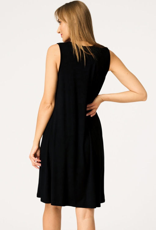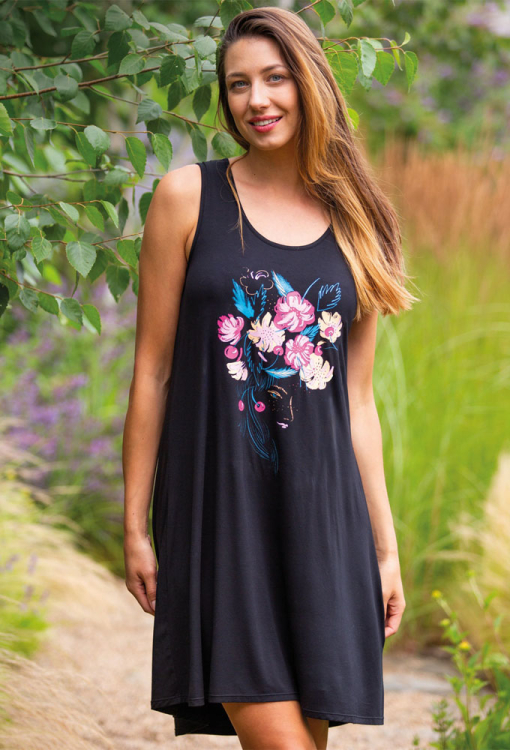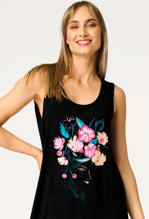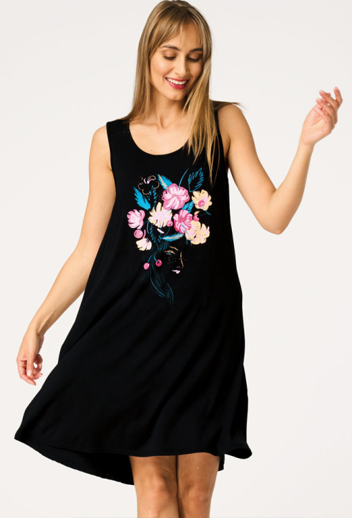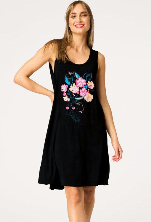 Легка нічна сорочка від польського бренду Key. Сорочка виконана з якісного та м'якого бамбука чорного кольору, з широкими бретелями та U-подібним вирізом горла. Модель вільного силуету, з подовженою спинкою і довжиною вище колін, спереду прикрашена яскравим квітковим принтом рожевого, персикового і бірюзового кольору. Нічна сорочка дуже гарна і комфортна, також підійде як домашня сукня або подарунок коханій і близькій людині.