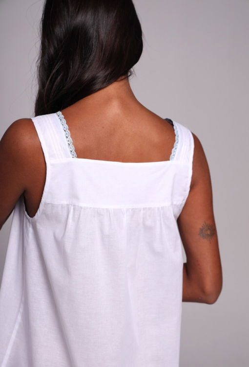 Чарівна жіноча трикотажна нічна сорочка Hloris від українського бренду German Volf. Сорочка виконана з якісного і м'якого батисту білого кольору, вільного силуету і довжиною вище колін. Модель на широких бретелях, із квадратним декольте і таким самим вирізом на спині, на грудях застібається на ґудзики, внизу оброблена невеликим воланом. Виріз та спинка моделі оброблені кокетками з м'якими складаннями та разом із бретелями прикрашені застроченими складками та тонким мереживом блакитного кольору. Нічна сорочка дуже гарна і комфортна, також може бути відмінним варіантом подарунка близькій або коханій людині!