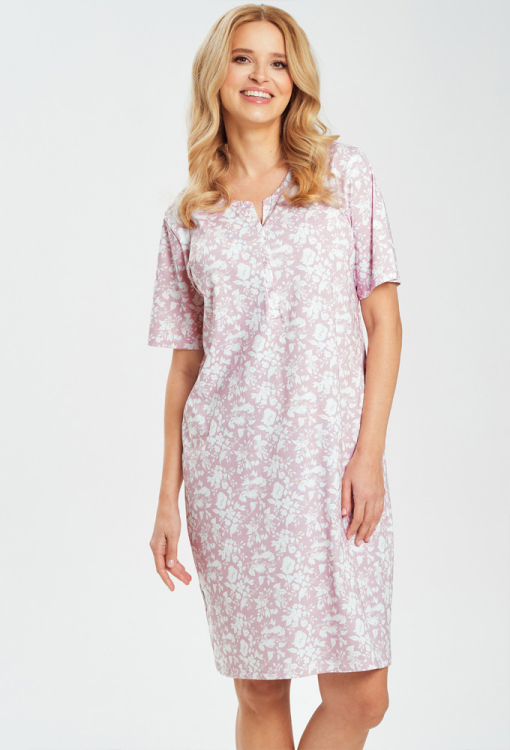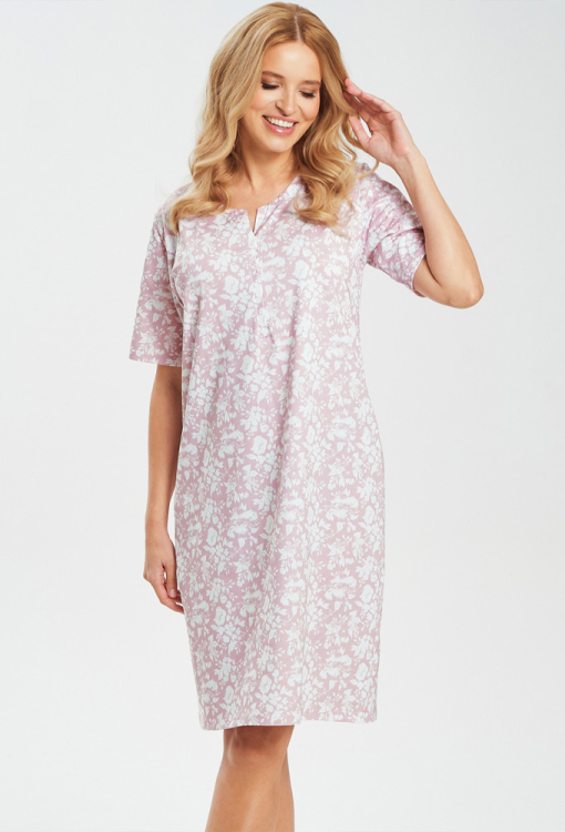 Класична нічна сорочка Adria від польського бренду Taro. Сорочка виконана з якісної та м'якої бавовни, рожевого кольору з білим квітковим принтом, прямого силуету та довжиною трохи вище колін. Модель з короткими рукавами та круглим вирізом горла, на грудях оброблена планкою на кнопках. Нічна сорочка дуже гарна і приємна до тіла, ідеальна як для сну, так і для лінивих ранкових годин, а також може бути корисним подарунком для близьких людей.
