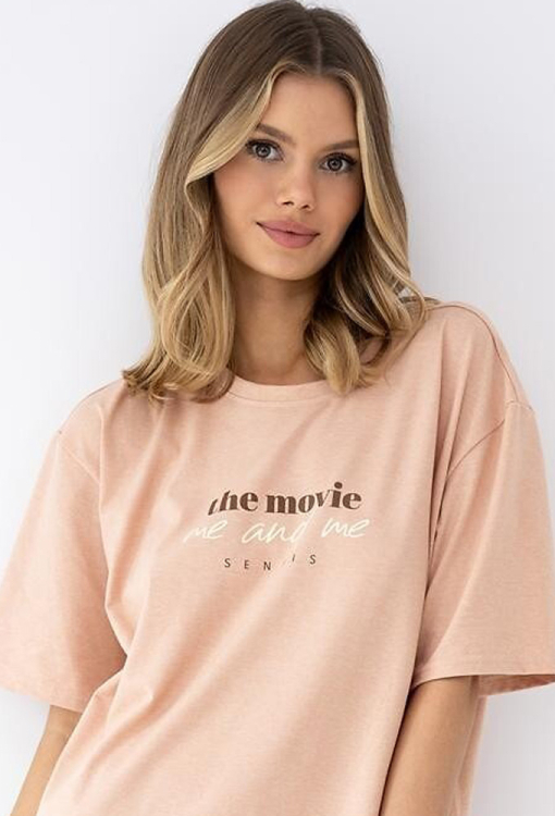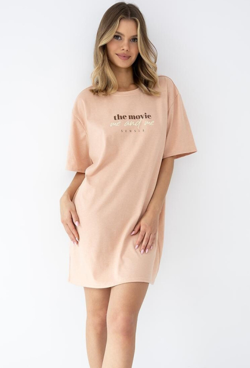 Стильна нічна сорочка Anika від польського бренду Sensis. Сорочка виконана з якісноїго та м'якого трикотажу бежевого кольору, вільного oversize силуету та довжиною вище колін. Модель із широкими короткими рукавами, заниженим плечовим швом та круглим вирізом горла, попереду прикрашена принтом із напису. Ніч дуже гарна і комфортна, полюбиться з першого разу, також може бути корисним подарунком коханій або близькій людині.